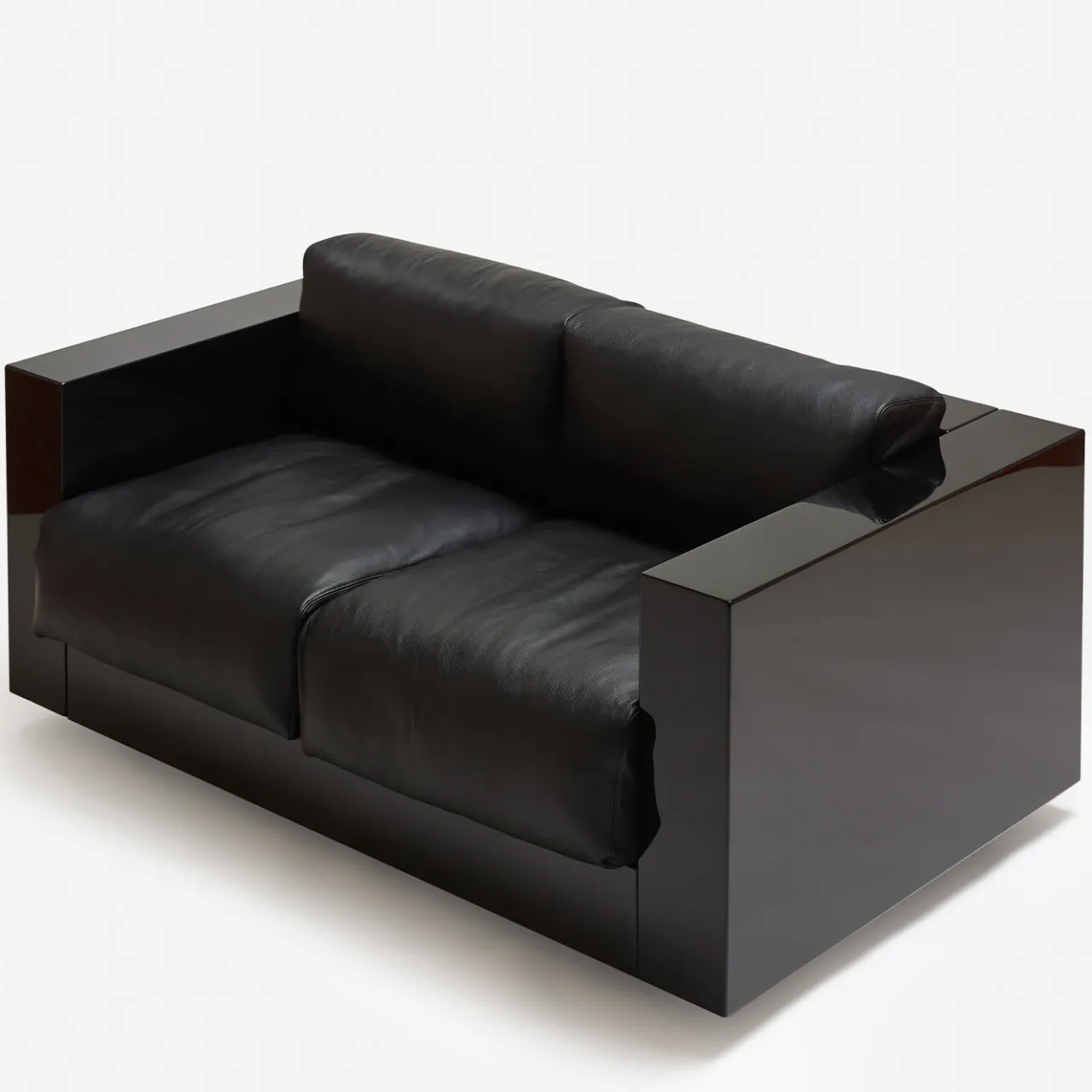 Stupendo divano a due posti o poltrona d’amore per aggiungere un accento unico e sofisticato in un interno contemporaneo, questo progetto di Lella e Massimo Vignelli si distingue per un look total black assolutamente raffinato. Caratterizzato da linee pulite ed essenziali, presenta una struttura in legno rifinita con una laccatura lucida in poliestere e completata da due sedute e due cuscini di schienale morbidamente imbottiti di piume e rivestiti in pelle di alta qualità.