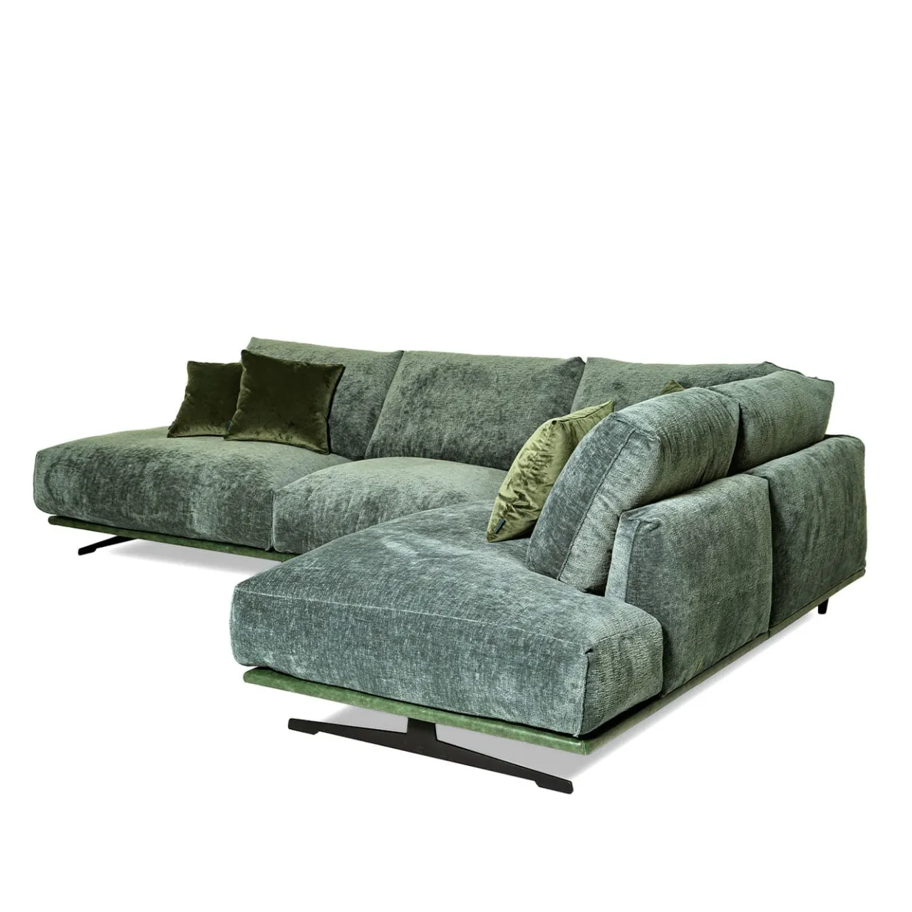 Il divano presenta componenti di seduta, schienali e braccioli dalle curve avvolgenti, sostenuti da una piattaforma su eleganti gambe a slitta. Questo design consente l’uso creativo di tessuti e colori, evidenziando il contrasto tra la struttura leggera e il resto del divano. I sedili, gli schienali e i braccioli offrono il massimo comfort, grazie a strati di poliuretano multi-densità ricoperti di piume d’oca certificate. Cuscini decorativi non inclusi.