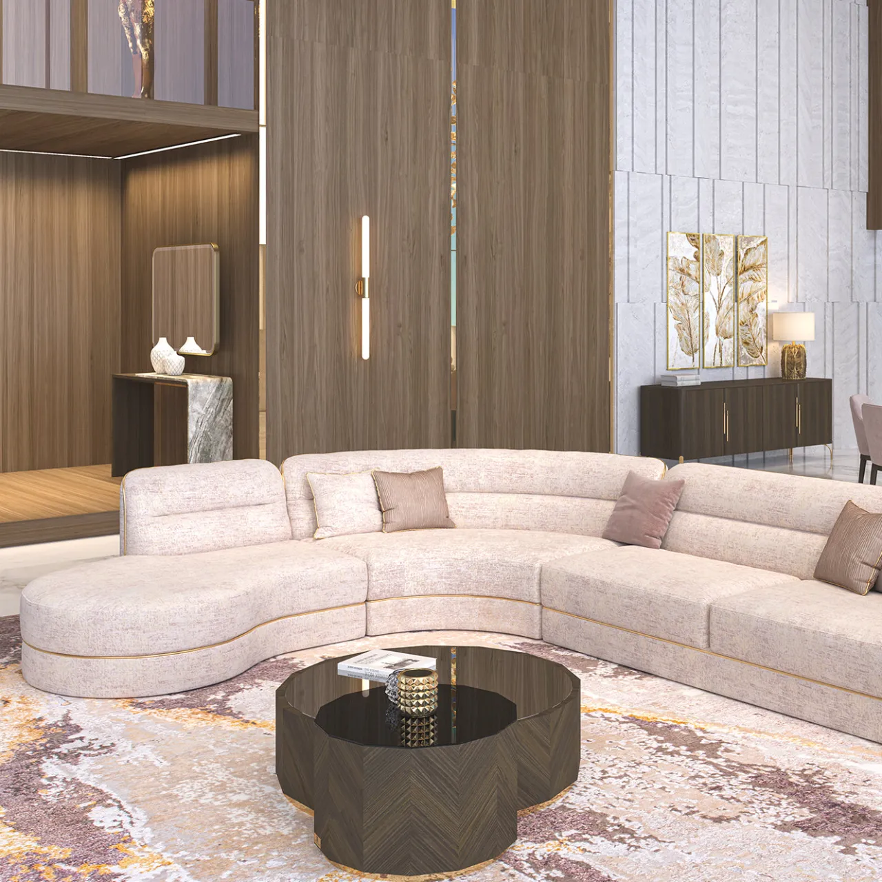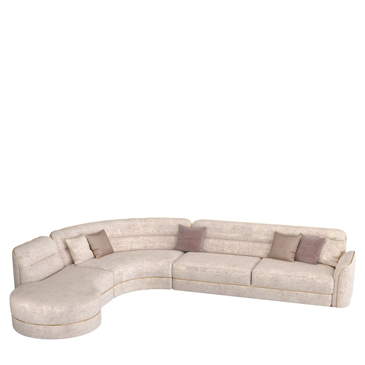 Divano angolare modulare a tre elementi, caratterizzato da una raffinata silhouette curva pensata per valorizzare gli interni contemporanei. La sua ampia capienza lo rende perfetto per momenti conviviali, dalle riunioni familiari all’accoglienza degli ospiti. Rivestito in un morbido tessuto di alta qualità, garantisce comfort prolungato e resistenza nel tempo. La configurazione modulare consente un’elevata flessibilità, adattandosi con facilità a diverse disposizioni spaziali senza rinunciare a coerenza estetica e stile.