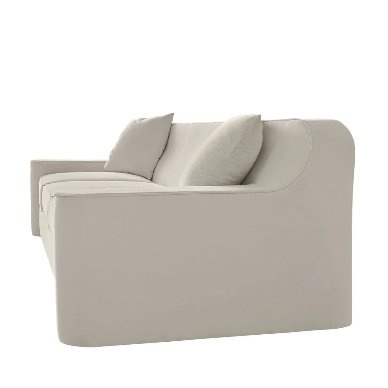 Linee morbide e senza soluzione di continuità definiscono questo splendido divano, interamente rivestito con un tessuto bianco panna personalizzabile in colore o in versione pelle a scelta. Caratterizzato da una silhouette geometrica pulita e compatta, accoglie fino a tre persone nella sua morbida seduta imbottita in poliuretano espanso e ovatta di poliestere. La struttura, realizzata in legno, è imbottita in poliuretano espanso a densità differenziata. I cuscini decorativi sono disponibili su richiesta, per i dettagli rivolgersi al Concierge.
