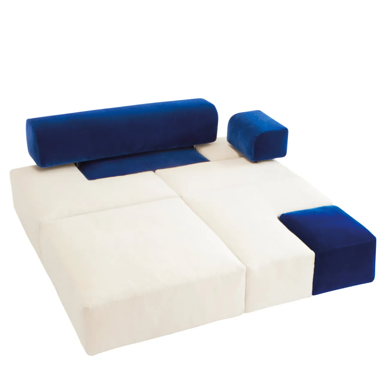 Questo esclusivo divano sarà il punto focale di qualsiasi salotto moderno grazie alle sue linee eleganti e alla sua versatilità. I quattro moduli sono costruiti su una struttura in legno di frassino imbottita con lattice naturale al 100% e piume d’oca e assemblati in forma quadrata. Rivestiti in tessuto di cotone bianco, tre moduli presentano un dettaglio angolare blu, lo stesso colore che ricorre nei cuscini dello schienale e del bracciolo singolo. Il sistema modulare Domino consente una totale personalizzazione, in quanto le sedute possono essere ruotate, spostate e divise, creando nuove composizioni come divano lineare, angolare a L e daybed.
