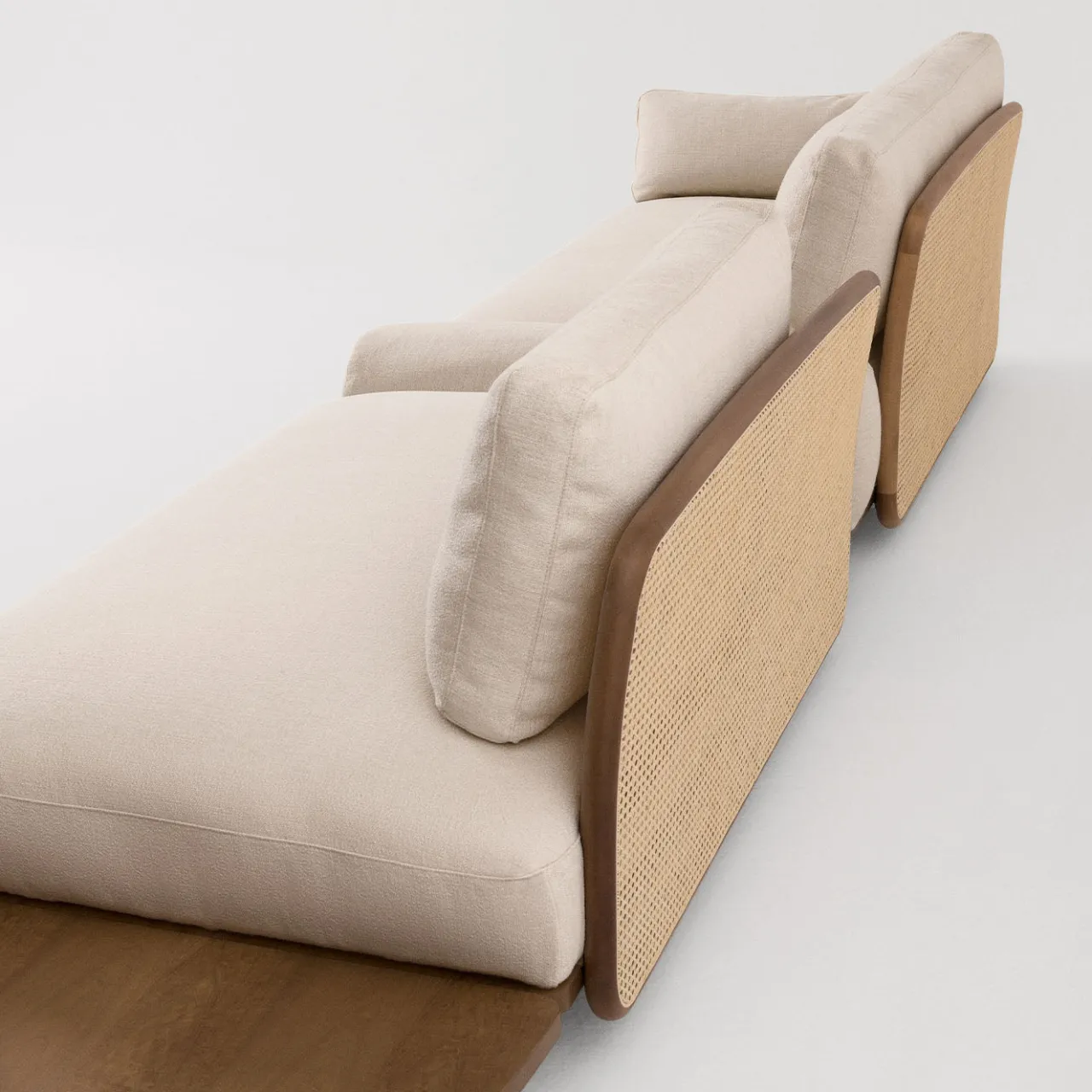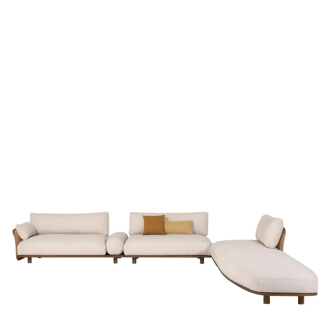 Il divano Ellipse bianco a 3 moduli di Chiara Andreatti presenta un sistema modulare con forme organiche e profili morbidi, evidenziando versatilità e asimmetria per disposizioni personalizzabili. Il design mette in risalto un telaio in legno curvo che avvolge i poggiatesta e i braccioli, arricchito da una trama in vimini viennese. I volumi rivestiti poggiano su una base in frassino naturale o canaletto in noce, che offre sia stabilità che leggerezza. Il set include due tavolini in legno integrati in modo armonioso nella composizione. I cuscini decorativi non sono inclusi.