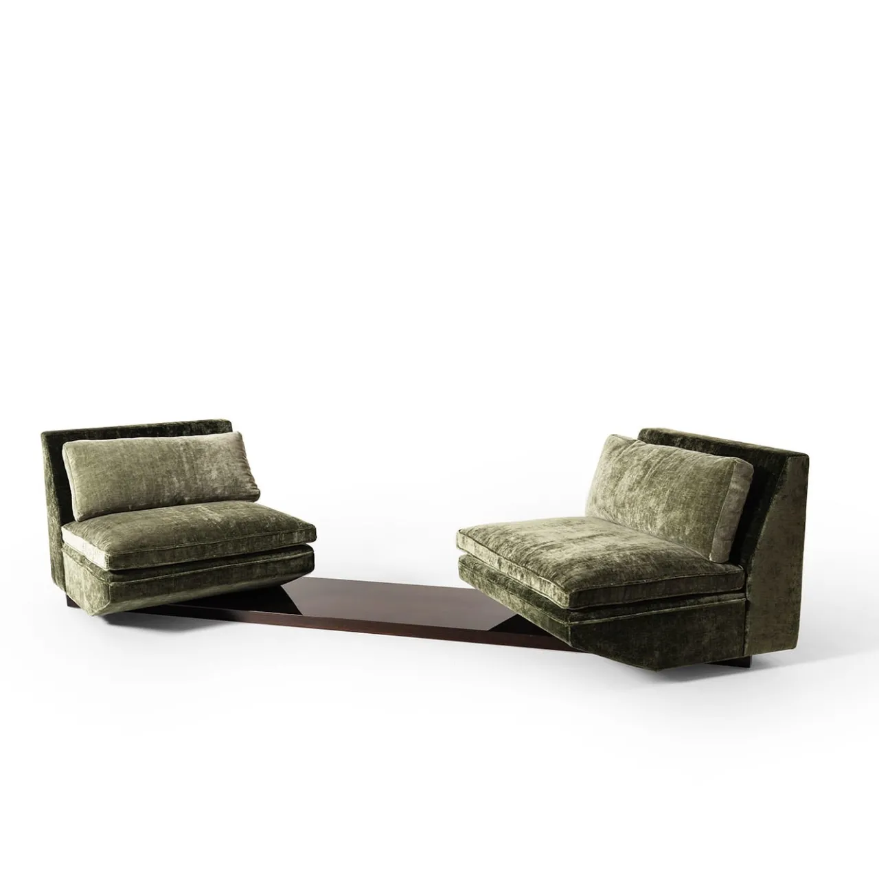 Le poltrone girevoli Collo di Storagemilano hanno un design modulare con sedute imbottite e rivestite in velluto verde disponibile in quattro tonalità. Montate su una base in legno di eucalipto laccato poliestere lucido, le poltrone integrano un sistema di rotazione che consente di ottenere molteplici configurazioni di seduta fronte-retro, affiancate o contrapposte, offrendo un comfort versatile e un fascino visivo contemporaneo. Questo set di medie dimensioni combina stile e adattabilità funzionale.