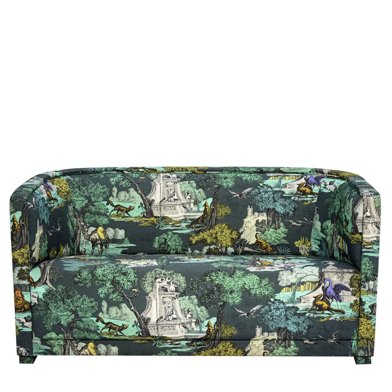 Sofisticati elementi architettonici che punteggiano un colorato scenario bucolico descrivono il prezioso tessuto che avvolge completamente questo divano esclusivo e compatto. Le sue dimensioni compatte e il design avvolgente sono un invito al relax o a sedersi per condividerlo con una persona speciale. Perfetto per adattarsi a un piccolo spazio abitativo o a un angolo di relax in un elegante studio privato.