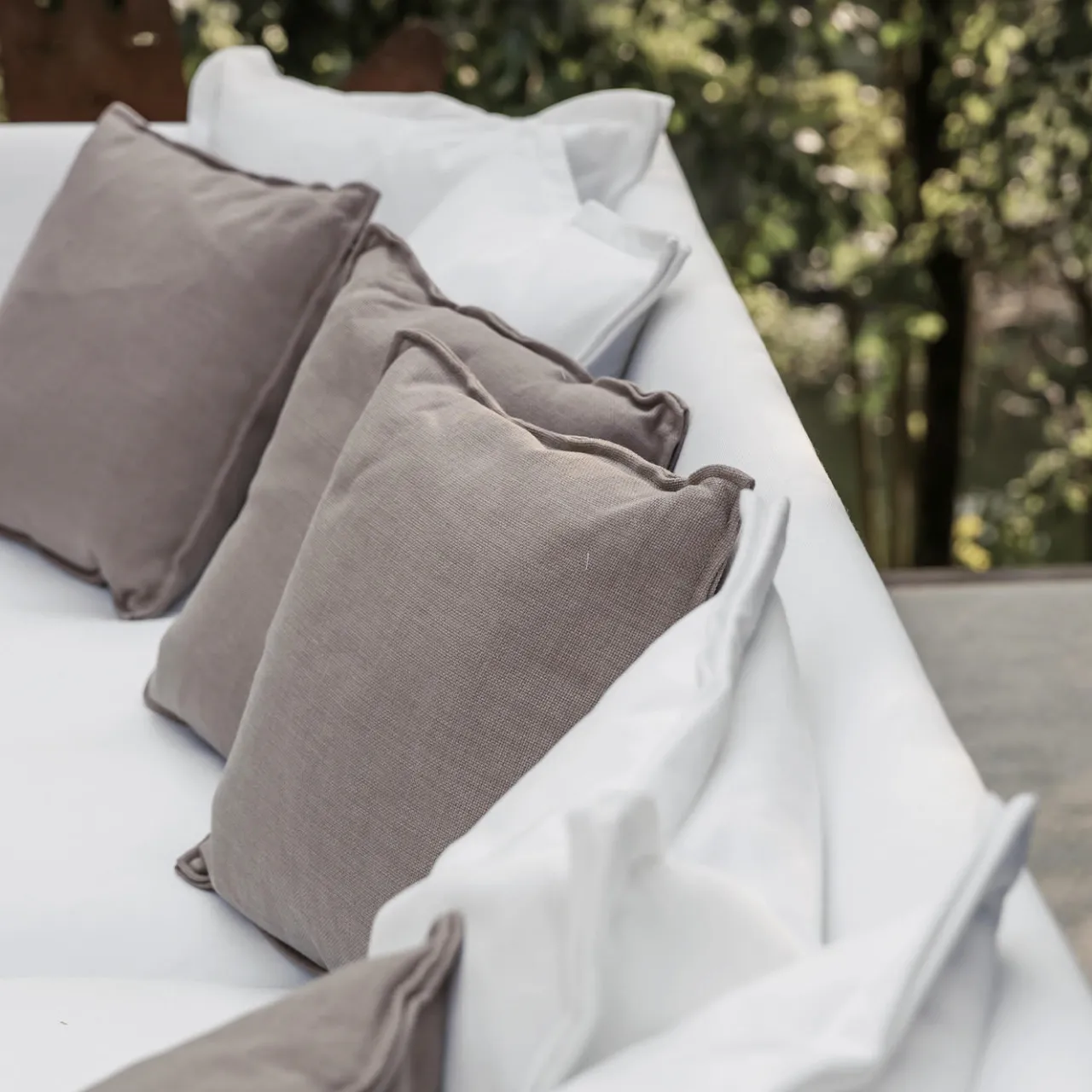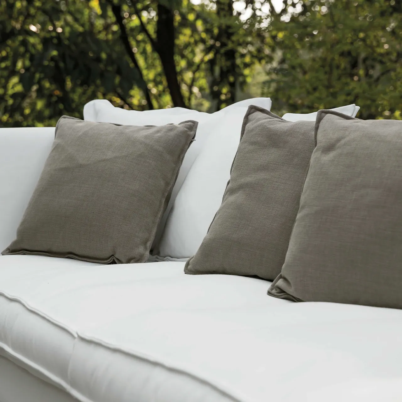 Questo divano dalle linee pulite, sollevato su piedi in legno verniciato, eleva un salotto all’aperto con la sua semplice eleganza. L’imbottitura in poliuretano con fodera impermeabile sostiene la solida struttura in legno, rivestita in tessuto bianco (sfoderabile) segnato da profili tono su tono. I cuscini della seduta sono dotati di molle di sospensione in acciaio per un sostegno eccezionale, mentre i cuscini dello schienale e quelli sciolti (quattro da 60×60 cm e quattro da 50×50 cm) sono rivestiti in tessuto impermeabile. Consultare il Concierge per le personalizzazioni disponibili.