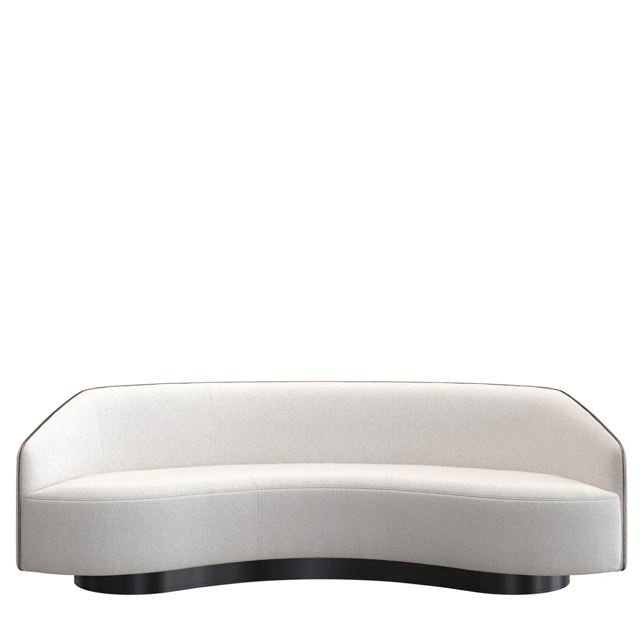 Divano da soggiorno con base in legno laccato nero che sostiene una silhouette scultorea distintiva. Rivestito in morbido tessuto bouclé, offre una superficie accogliente e tattile, arricchita da piping in eco-pelle color antracite intenso. Questo pezzo combina un design raffinato con un comfort superiore, donando un’atmosfera elegante e sofisticata agli spazi living.
