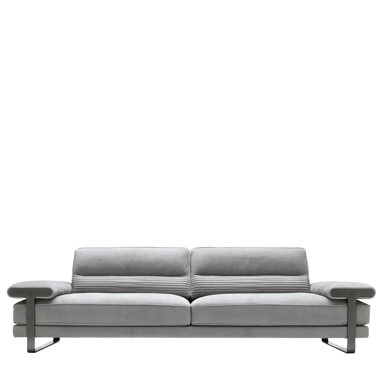 Divano a quattro posti in tessuto Sedute e fianchi del divano con cuciture speciali. Braccioli bassi. Gambe e finiture metalliche sui braccioli in acciaio inox satinato nero nichel con logo Giorgio Collection laserato.