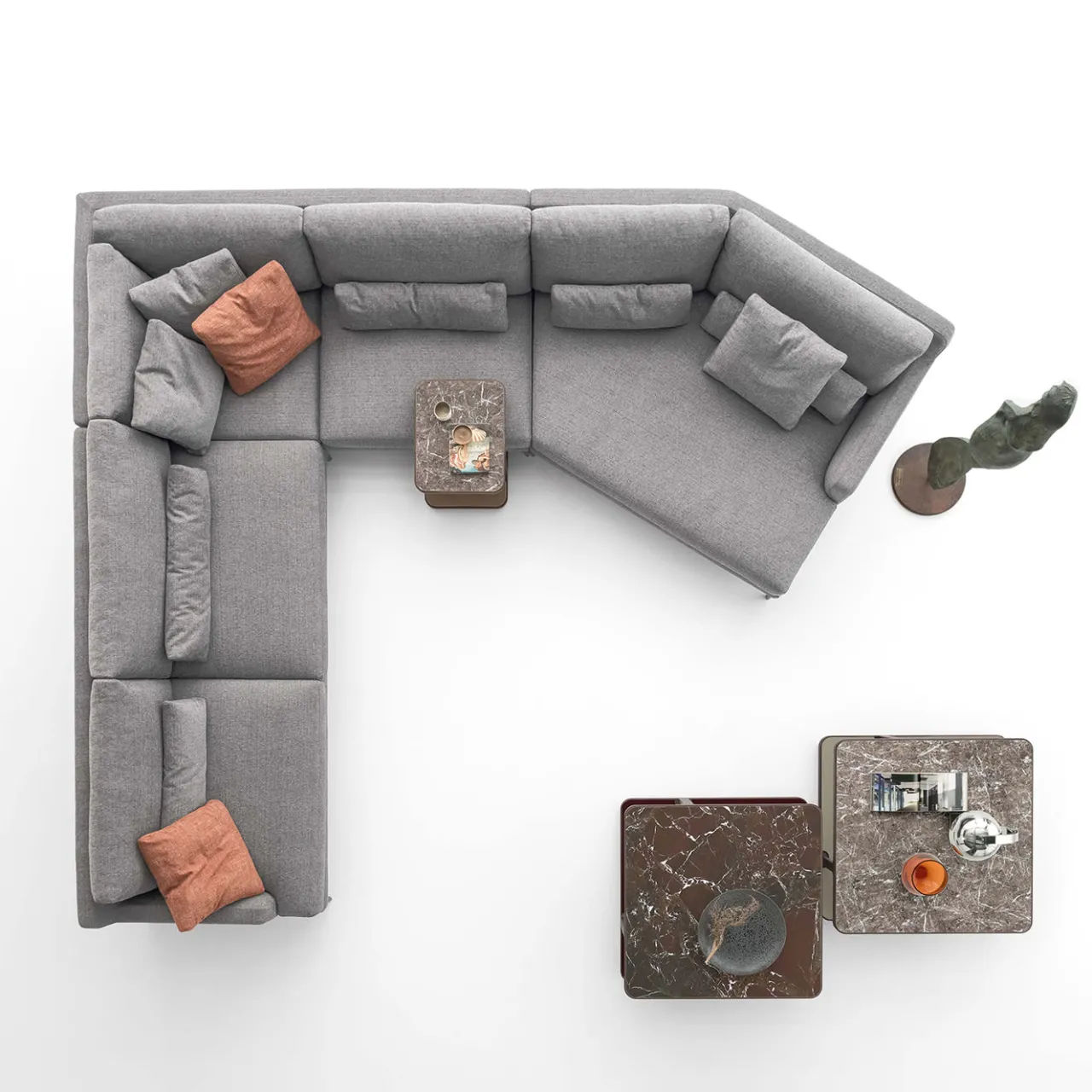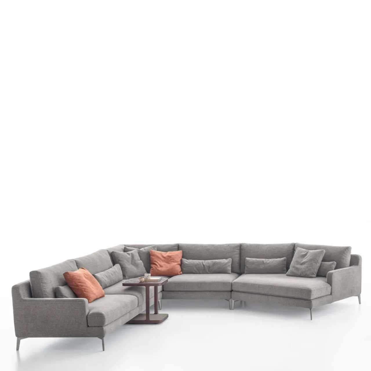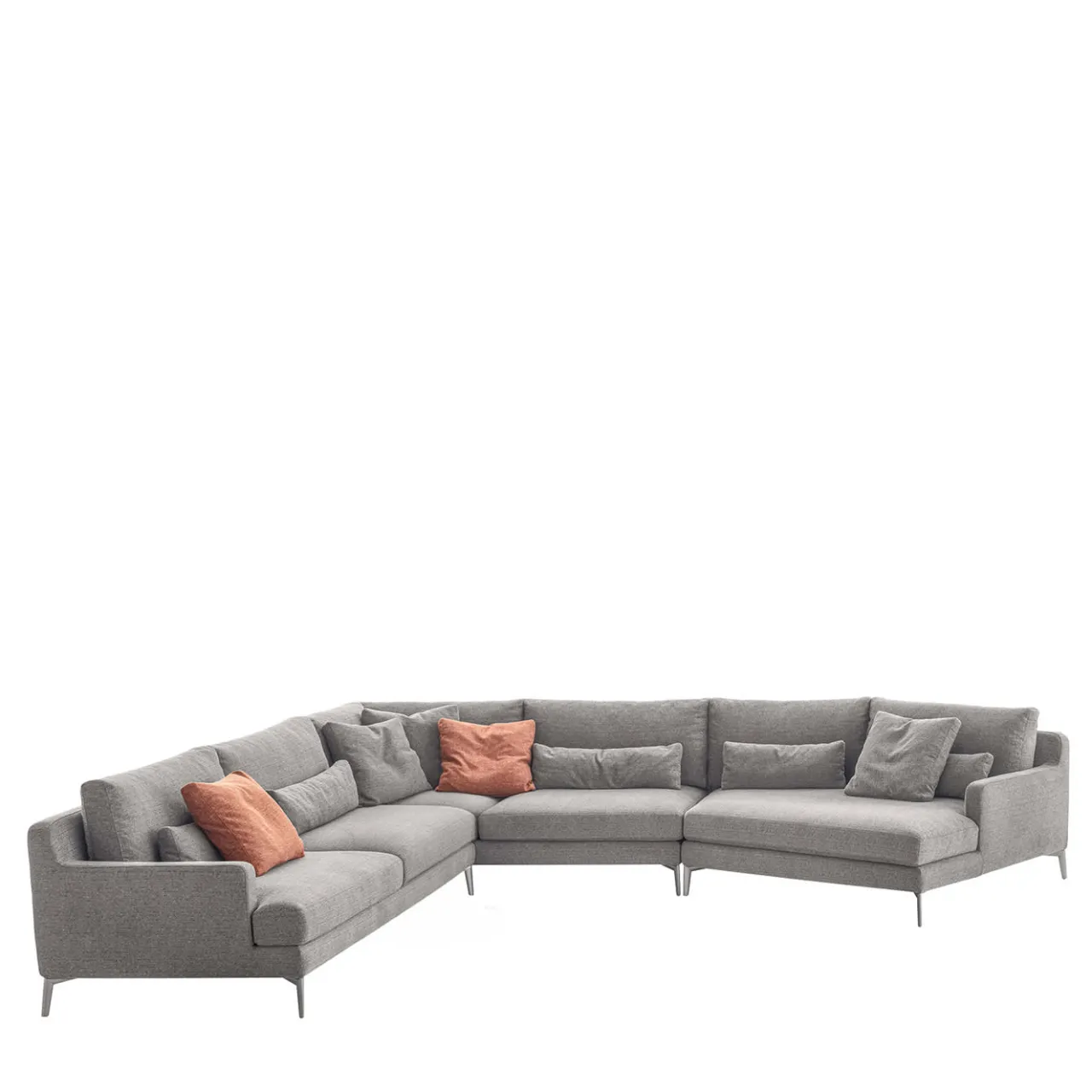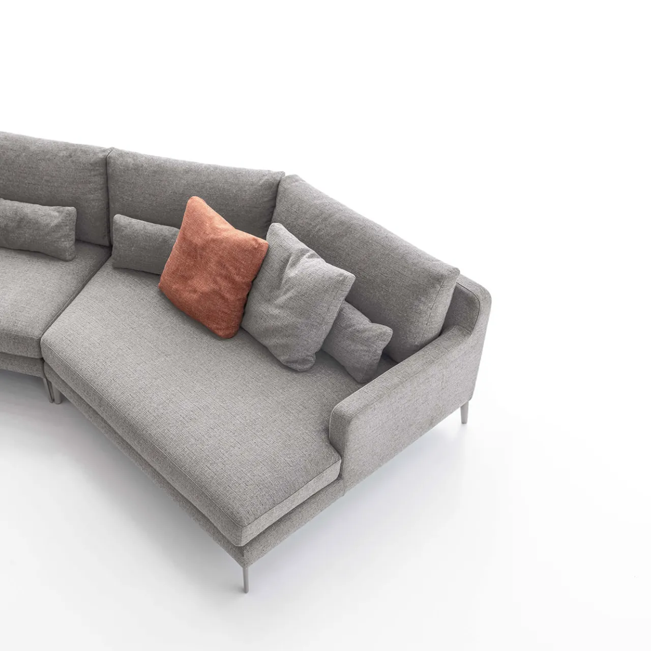 Questa composizione modulare del divano Edward è progettata per integrarsi perfettamente in eleganti ambienti open space. Il comfort eccezionale è garantito dalla generosa imbottitura in poliuretano espanso, ulteriormente valorizzata da inserti in piuma d’oca nei cuscini dello schienale. Il divano è rivestito in un sofisticato tessuto dalle tonalità marrone-grigiastre e poggia su piedini in alluminio con una raffinata finitura Peltrox. Sono inclusi cuscini lombari, tre cuscini grigi e due cuscini color ruggine, come mostrato in foto.