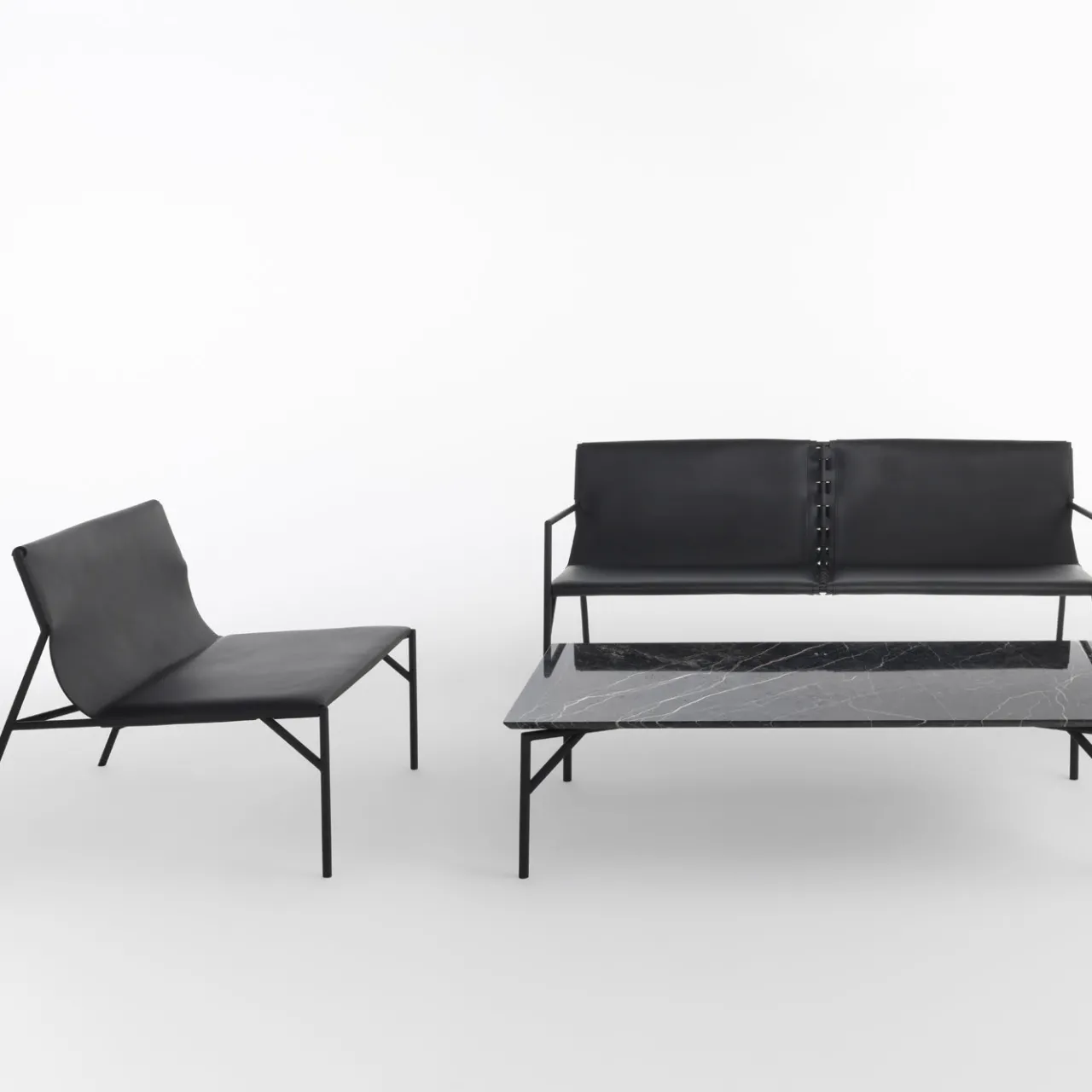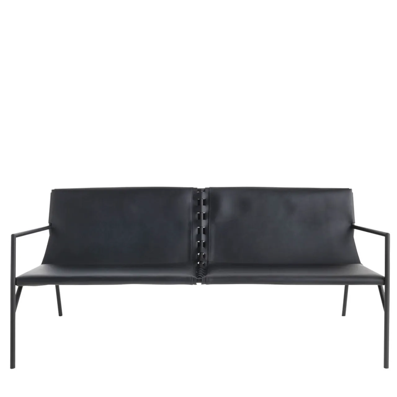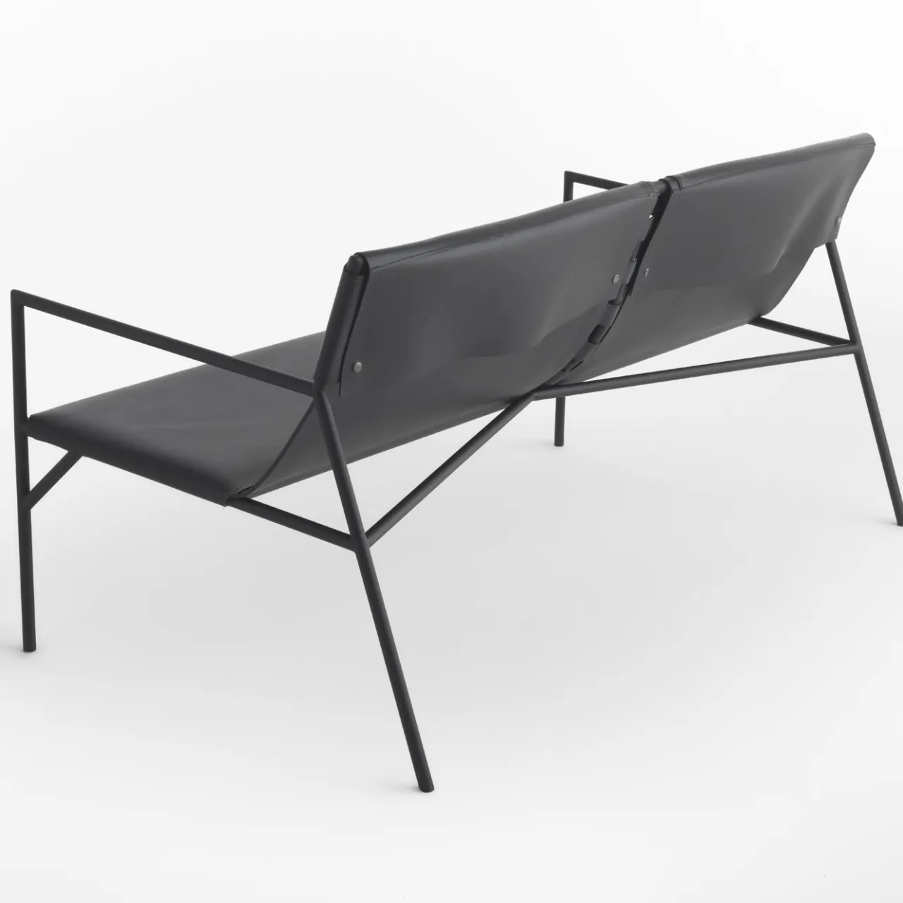 Divano sottile ed elegante di Marc Thorpe, questo pezzo combina una struttura solida con materiali raffinati per un carattere sofisticato. Dal design semplice e minimale, comprende una struttura in metallo nero con gambe tubolari e braccioli, e un raffinato rivestimento in pelle nera per i cuscini della seduta e dello schienale.