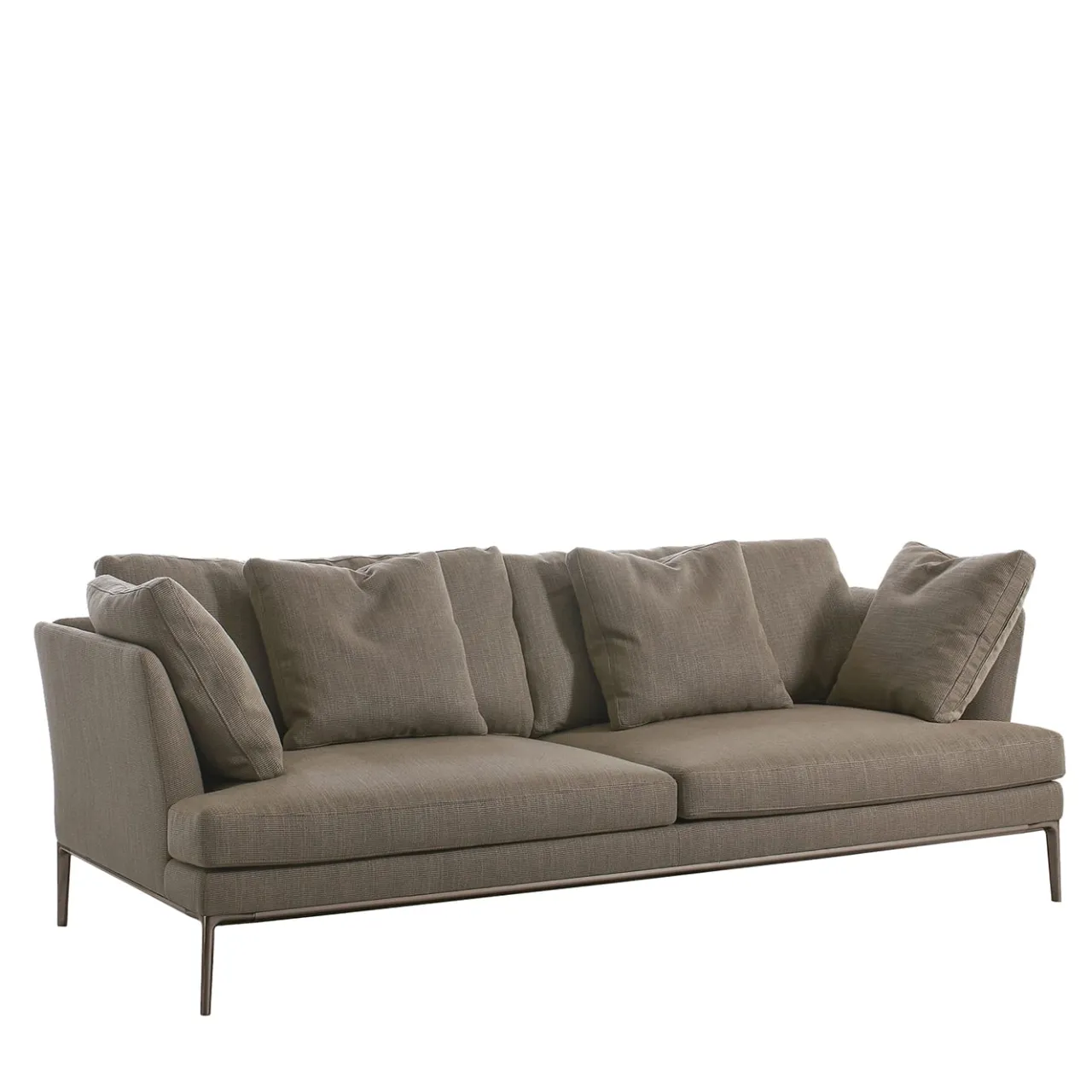 Ricco di tranquilla eleganza, questo divano rivela inequivocabilmente la sua ispirazione moderna al primo sguardo. La base in alluminio estruso con piedini in alluminio pressofuso rifiniti in bronzo offre un sostegno solido e discreto alla struttura generale in legno, rivestita in poliuretano espanso e completata da una morbidissima imbottitura in velluto marrone. L’imbottitura in piuma d’oca sterilizzata dei braccioli e dei cuscini dello schienale garantisce il massimo comfort. Contattare il Concierge per conoscere le varianti disponibili.