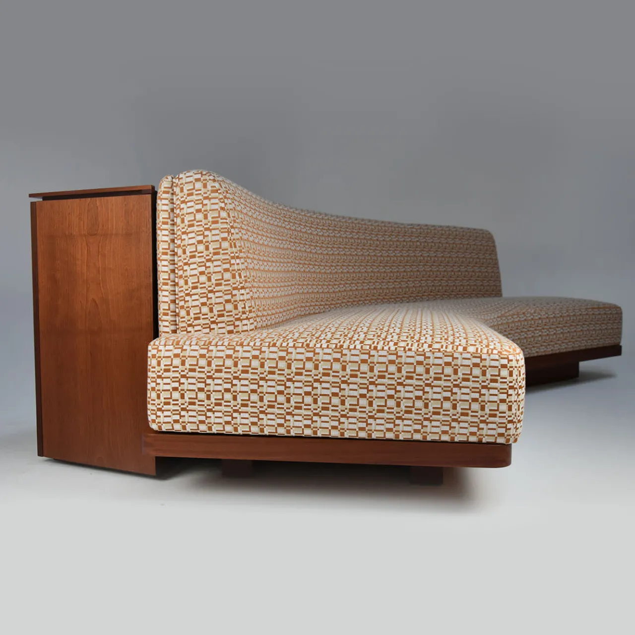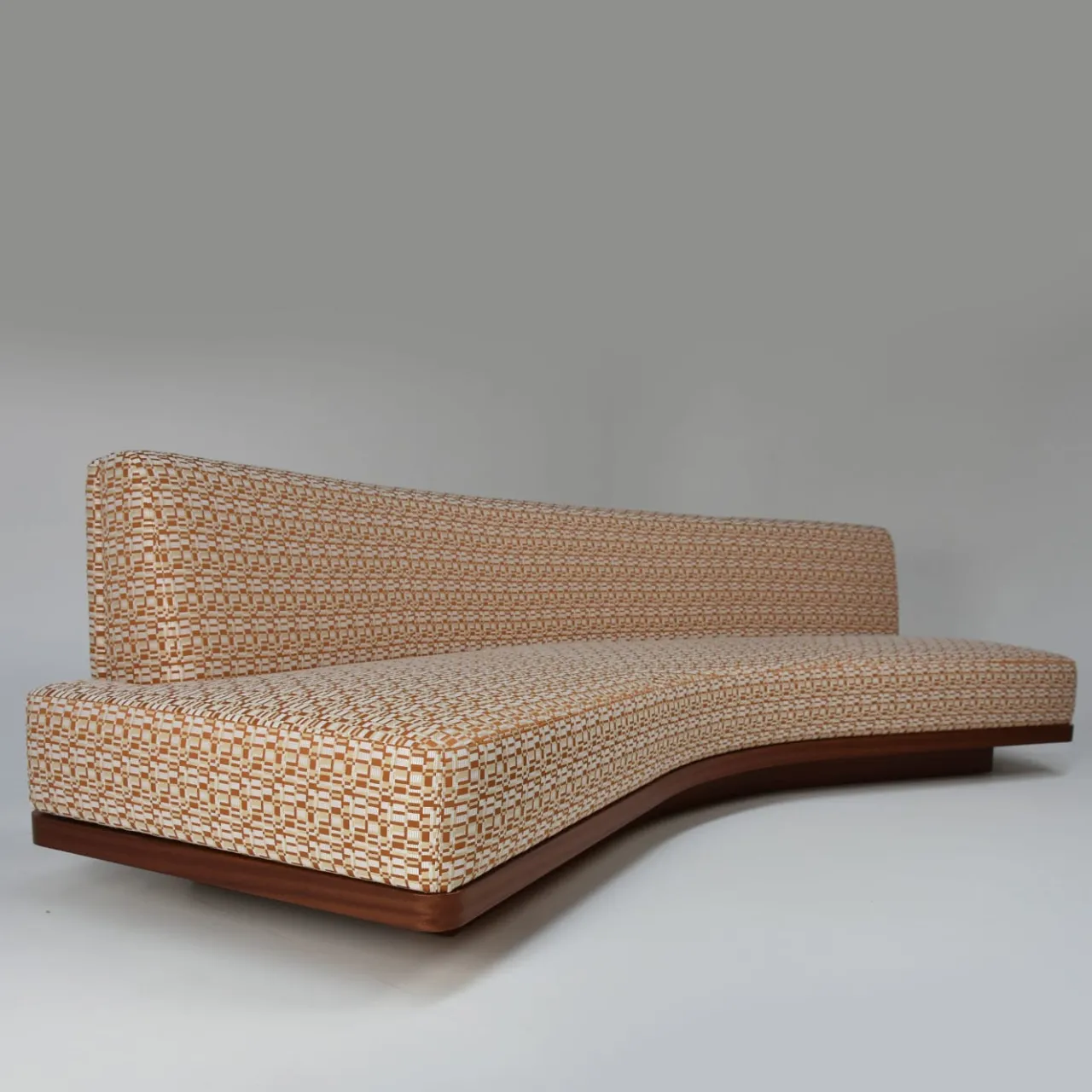 Divano con mobile posteriore in multistrato di mogano con intarsio a righe di giraffa, con due ante e un ripiano. Viene fornito con cuscini sparsi su richiesta ed è rivestito in un tessuto con un sottile motivo jacquard a quadri che mescola tre colori armoniosi. Questo pezzo è ideale per completare qualsiasi arredamento con il suo motivo geometrico.