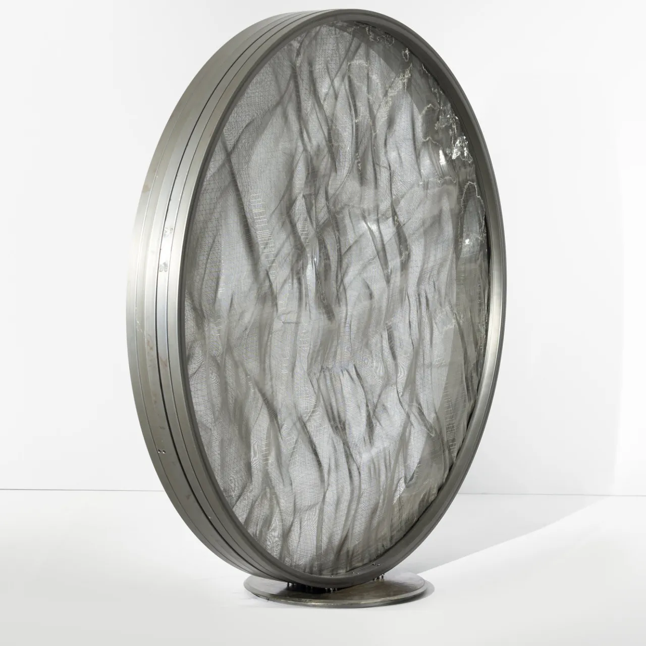 Questo squisito e versatile divisorio per ambienti è composto da tre elementi circolari che si sovrappongono e si dispiegano mentre si rotolano, creando un effetto dinamico per un pezzo che è sia decorativo che funzionale.