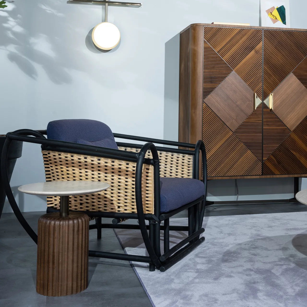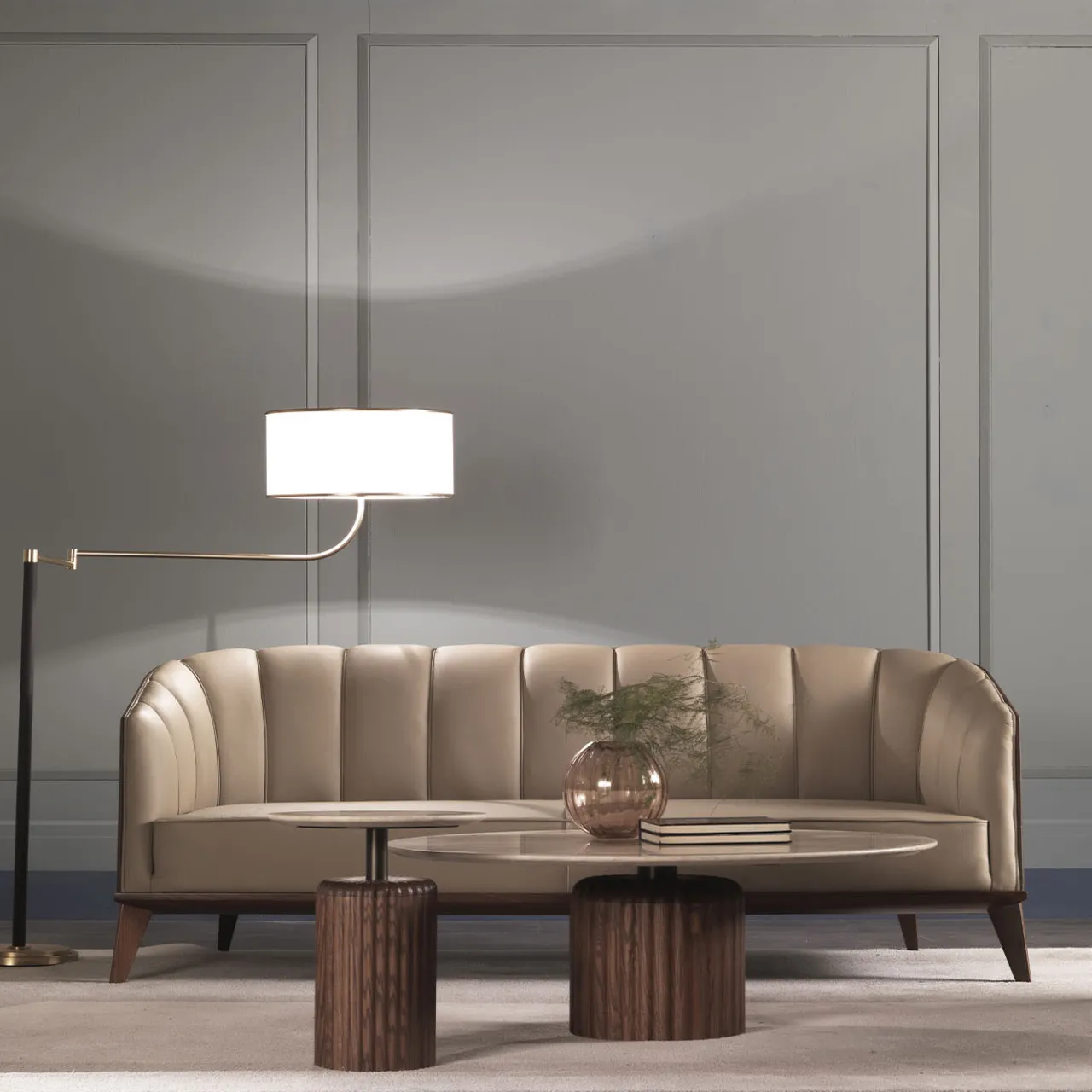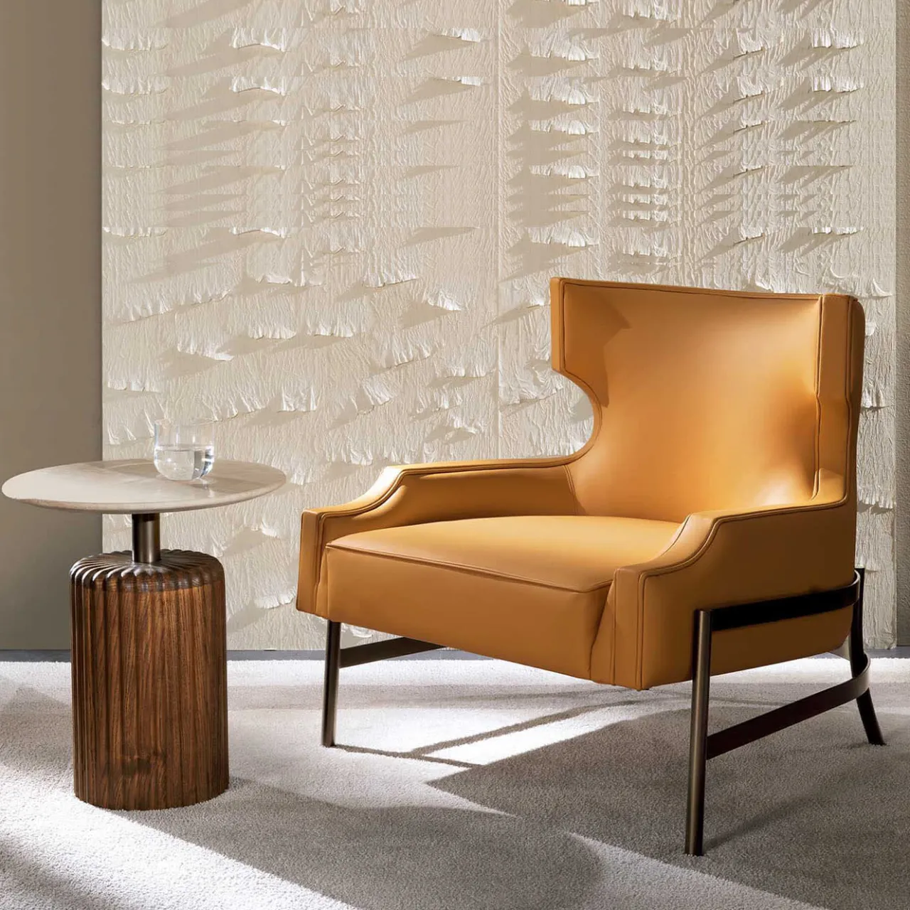Volumi geometrici esaltati da affascinanti contrasti di finitura e texture conferiscono a questo tavolino un fascino esclusivo. Un piano rotondo in marmo travertino, che presenta venature uniche, sormonta una base scultorea in frassino tinto noce, arricchita da una sofisticata texture scanalata. Un cilindro di metallo bronzato che collega la base al piano rivela la struttura del tavolo.