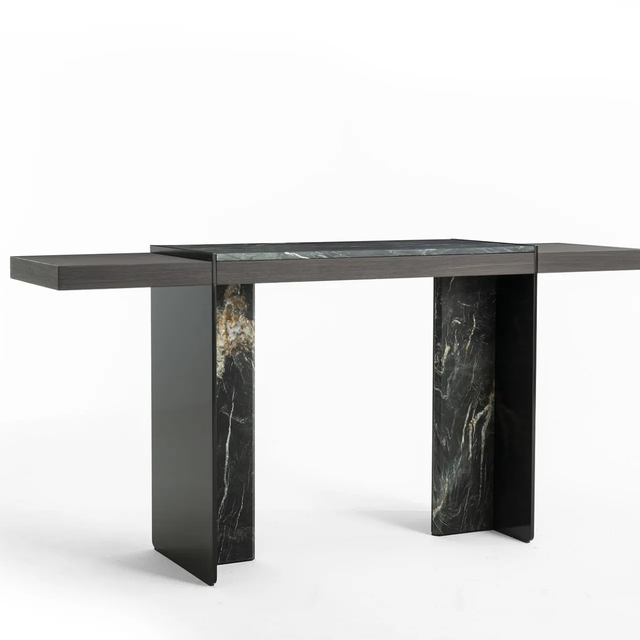 Volumi rigorosamente intersecati definiscono la silhouette scultorea di questa consolle di design, che rivela il suo fascino unico grazie all’ampio uso del pregiato marmo Belvedere. Dettagli in metallo nero con una sofisticata finitura spazzolata arricchiscono il pezzo, che si inserisce in modo eccellente in esclusivi foyer contemporanei alla ricerca di un tocco di profondità cromatica.
