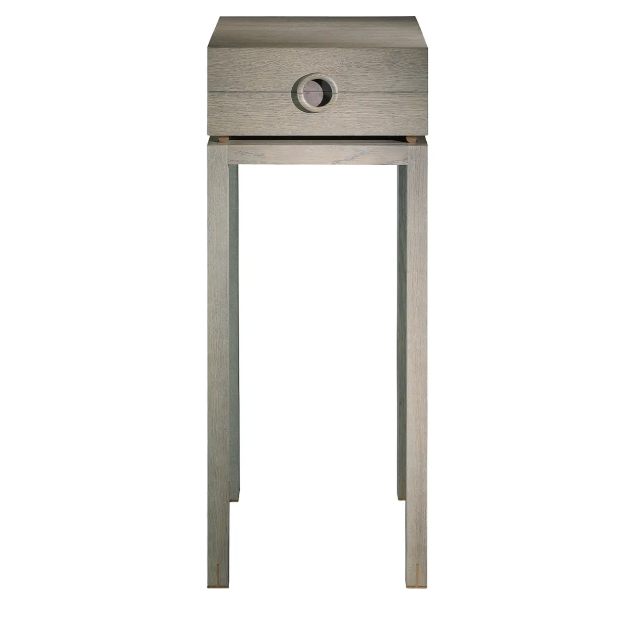 Il comodino alto presenta una struttura in rovere, con cassetti disponibili in melamina nera o rovere tinto. La caratteristica maniglia “RING”, rivestita in sughero tinto, completa la struttura in rovere. Rifinito in rovere tinto “Steel” e con eleganti aste in bronzo, aggiunge un tocco moderno e industriale a qualsiasi camera da letto. Combinando materiali raffinati e design accurato, offre eleganza e funzionalità per gli interni contemporanei.