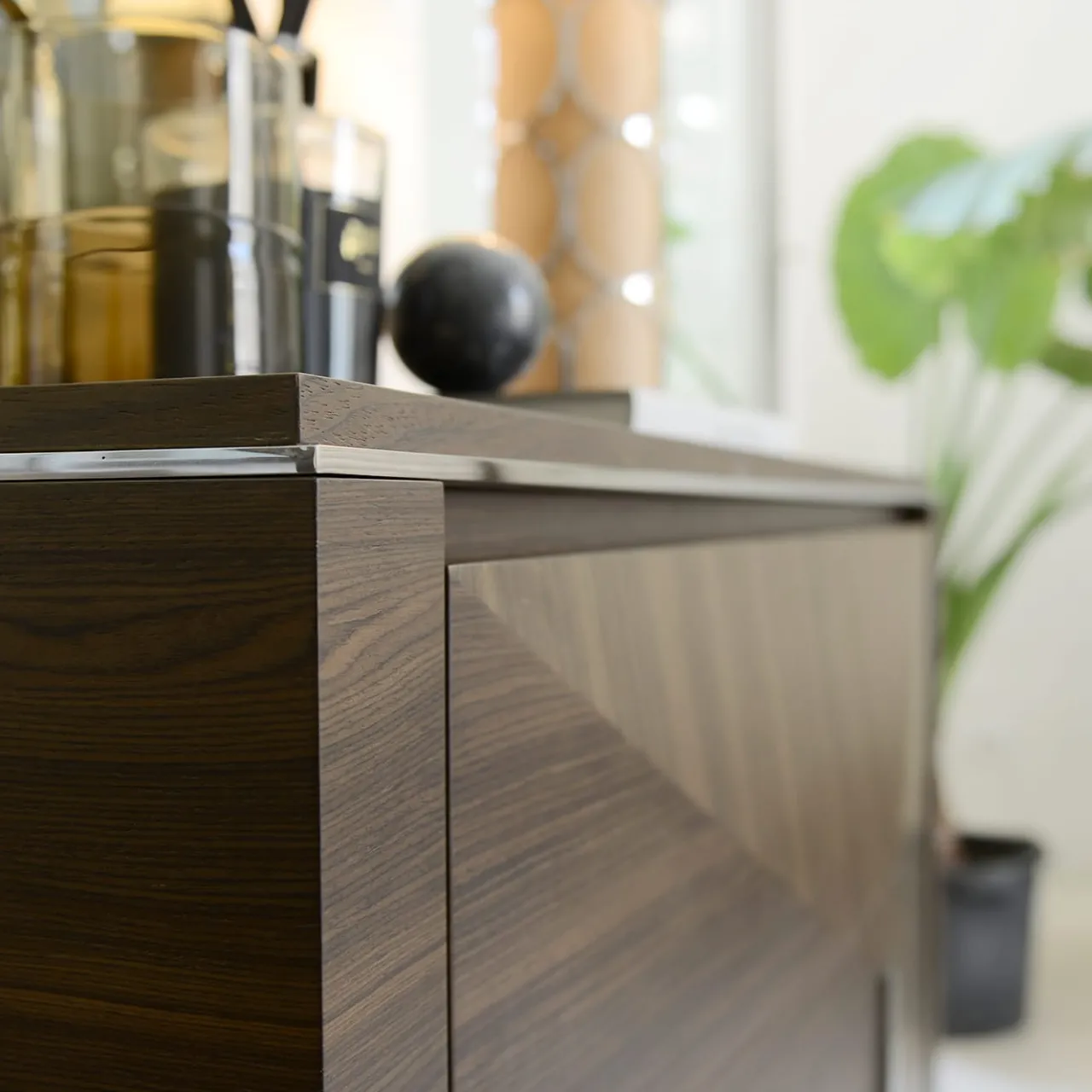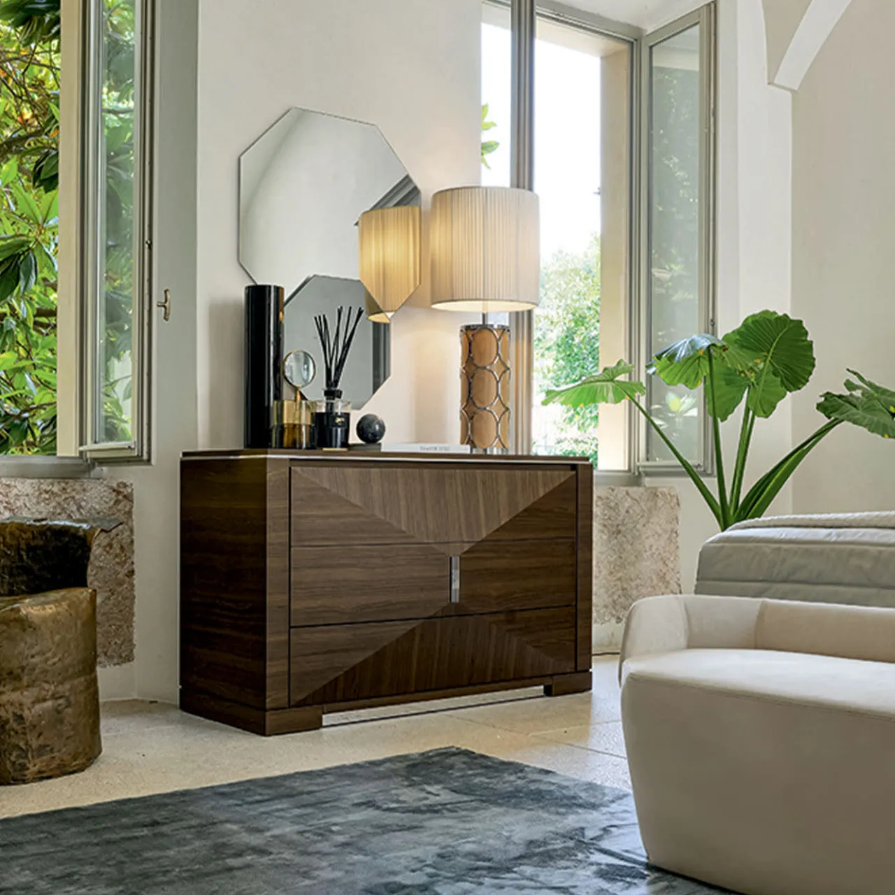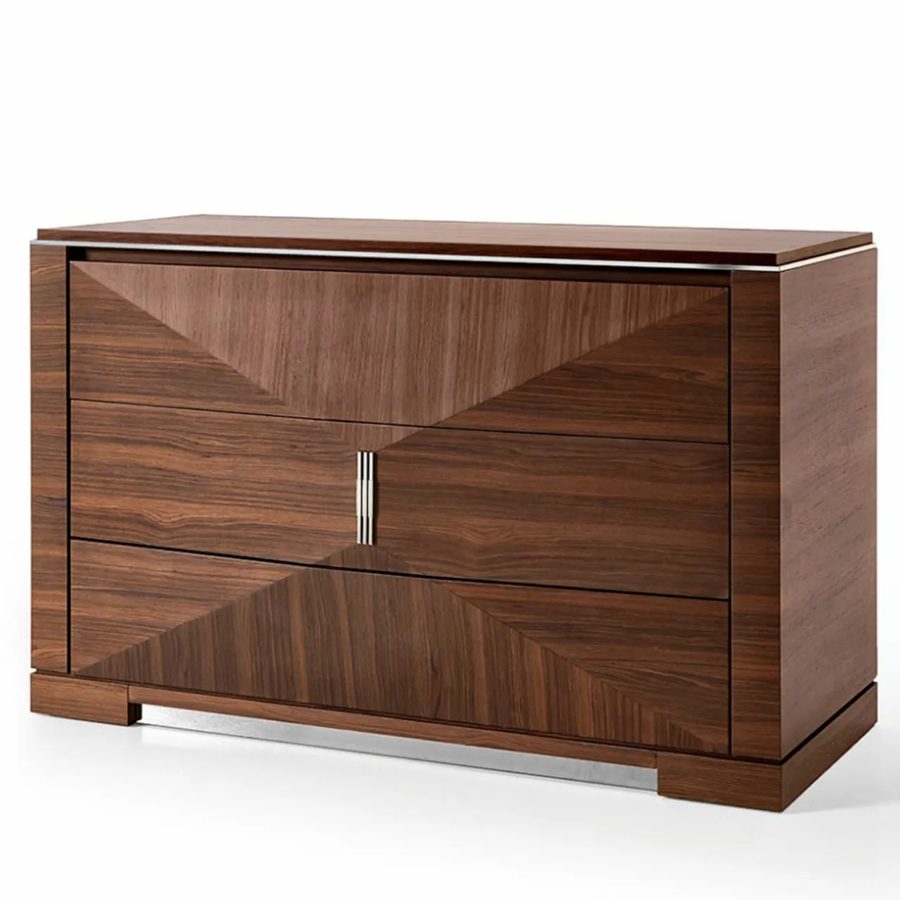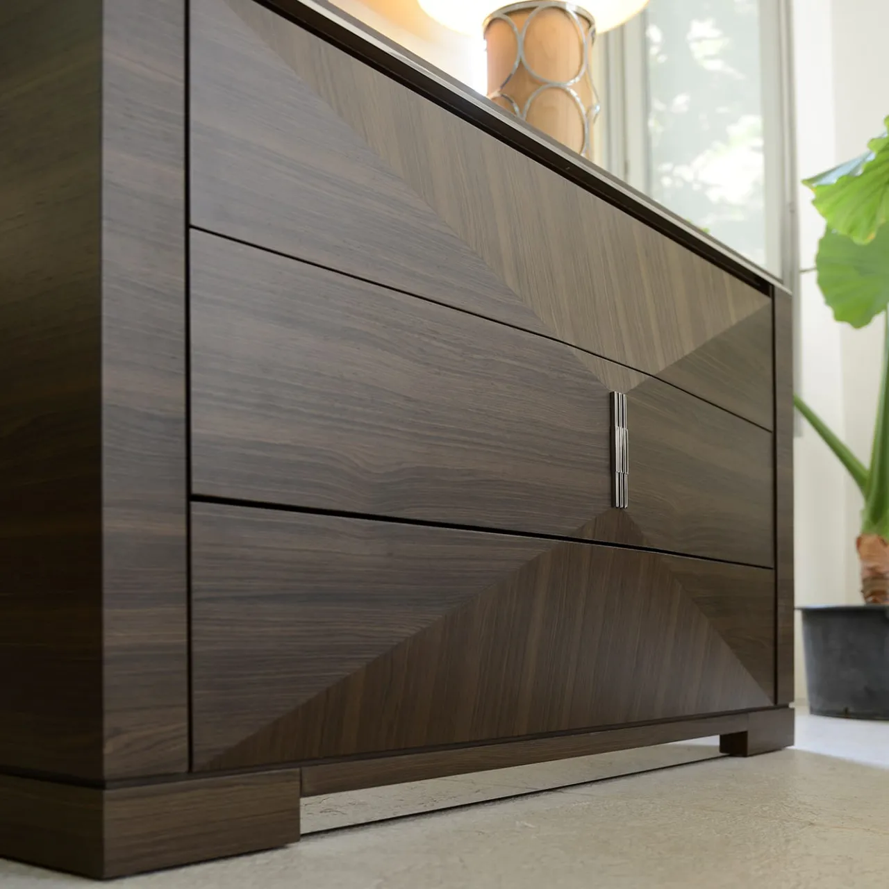 Comò a tre cassetti con finiture in metallo e apertura push pull. Caratterizzato da una finitura opaca Canaletto, i dettagli sono in metallo cromato.