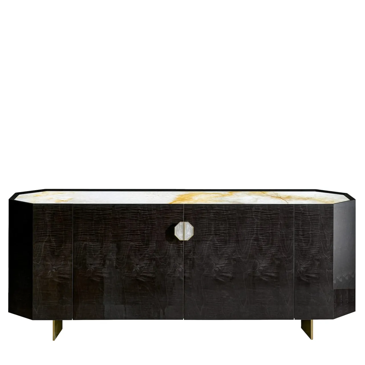 Questa elegante credenza ha due ante in legno arricchite dalla finitura lucida Pantera. Rifiniture in metallo ottonato, gambe laccate e ripiani in vetro arricchiscono il design. L’apertura è facilitata da una maniglia in marmo di Carrara, in tinta con il prezioso top bianco.