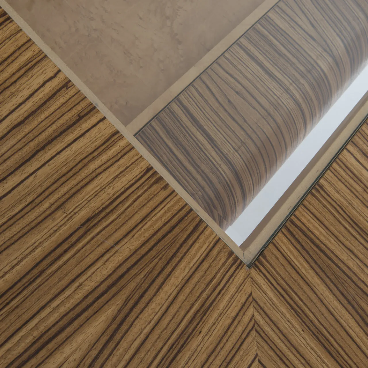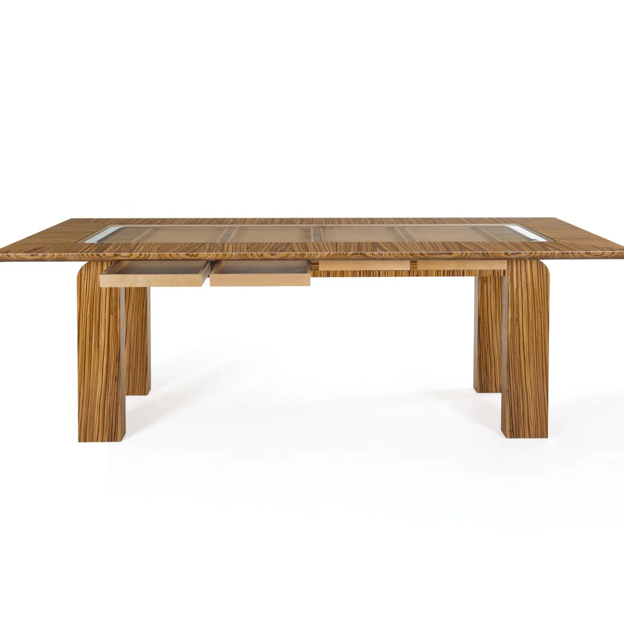 Questo tavolo in legno di zebrano presenta una silhouette minimalista che si aggiunge con eleganza a qualsiasi arredamento, classico o contemporaneo. Il piano rettangolare, il bordo perimetrale e le gambe sono interamente realizzati in legno di zebrano con accenti in acero affumicato e radica di acero. Il centro del piano è impreziosito da un inserto rettangolare in vetro di alta qualità, fissato su tutti i lati. Questo pezzo offrirà un’esperienza culinaria esemplare a tutti gli ospiti. Disegnato da Antonio Berdondini, anno 1947.