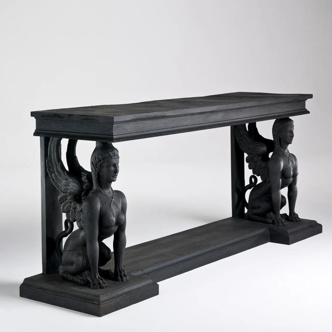 Fa parte della collezione Good Vibraions la consolle Fontainbleau di Ferruccio Laviani. È composta da gambe intagliate a forma di sfinge, che appaiono come guardiani gotici a guardia della zona giorno. L’oggetto rivoluziona il concetto di bellezza immutabile, grazie alla sua unicità e alla sua finitura “bruciata”, che conferisce al pezzo un effetto vistoso.