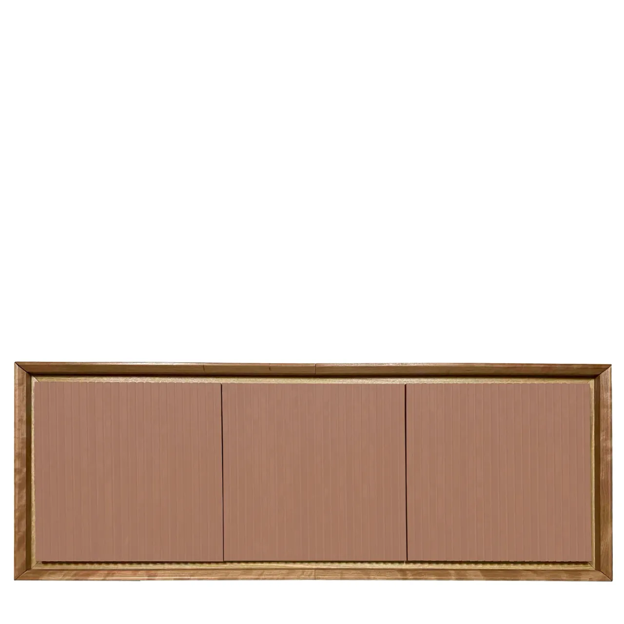 Madia sospesa a parete che misura 160 x 48,5 x h 58 cm, con una struttura in rovere e telai in legno di ciliegio e tre ante laccate nel colore Pantone mochi mousse, tonalità dell’anno 2025. Include due ripiani interni che offrono ampio spazio di stoccaggio con una silhouette minimalista e moderna adatta per interni contemporanei.
