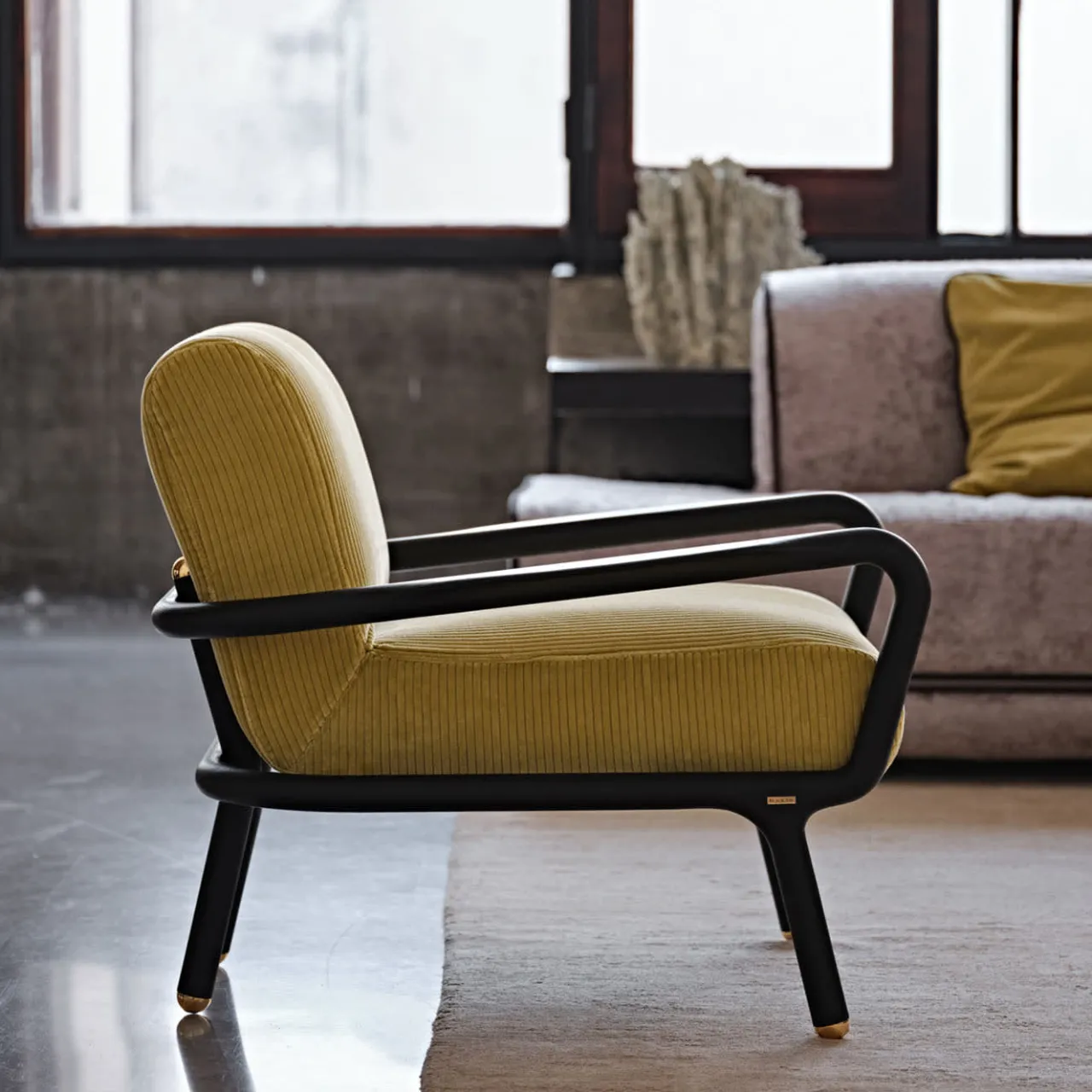Linee pulite e dinamiche delineano la silhouette moderna di questa poltrona, la cui seduta dalla silhouette indulgente la rende perfetta per riposare in compagnia di un buon libro. Dettagli dorati lucidi accentuano le punte della sua struttura cilindrica in frassino massiccio, tinto in una profonda tonalità moka che risulta ravvivata dal giallo del rivestimento in tessuto canalizzato (sfoderabile). Imbottito in poliuretano espanso ad alta resilienza, è disponibile anche nella variante in pelle.