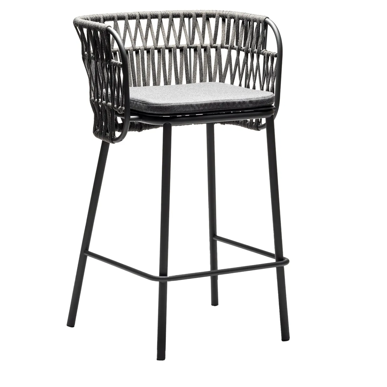 Questo elegante sgabello da bar ha una struttura in acciaio verniciato a polvere color antracite. Schienale intrecciato a mano con mèlange Maine in corda Giotto 8. La seduta imbottita è realizzata in tessuto Vortice Natte. Adatto per uso esterno.