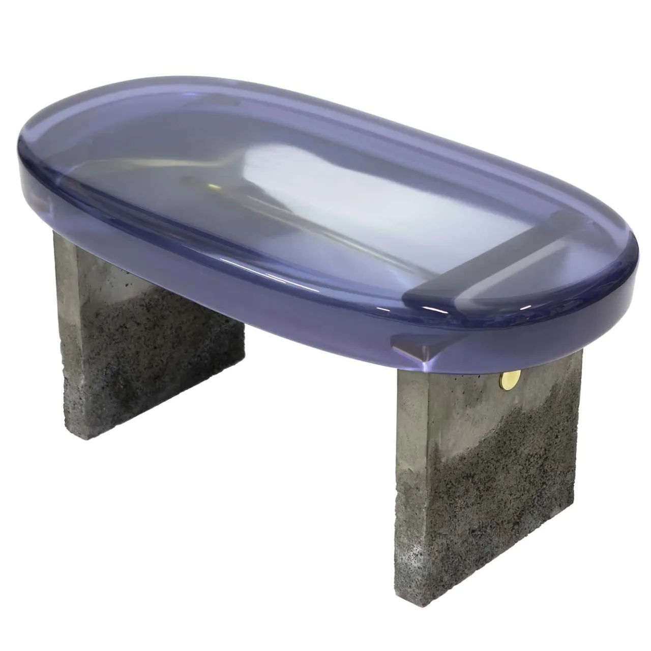 La panca Golia presenta una composizione formale stilizzata, in cui la spessa seduta ovale in resina epossidica è sostenuta da gambe squadrate in cemento, congiunte da una barra di ottone. La resina trasparente rivela il metallo lucente sottostante, creando una visione a più livelli che alleggerisce la solidità della base. Disponibile in altri colori.