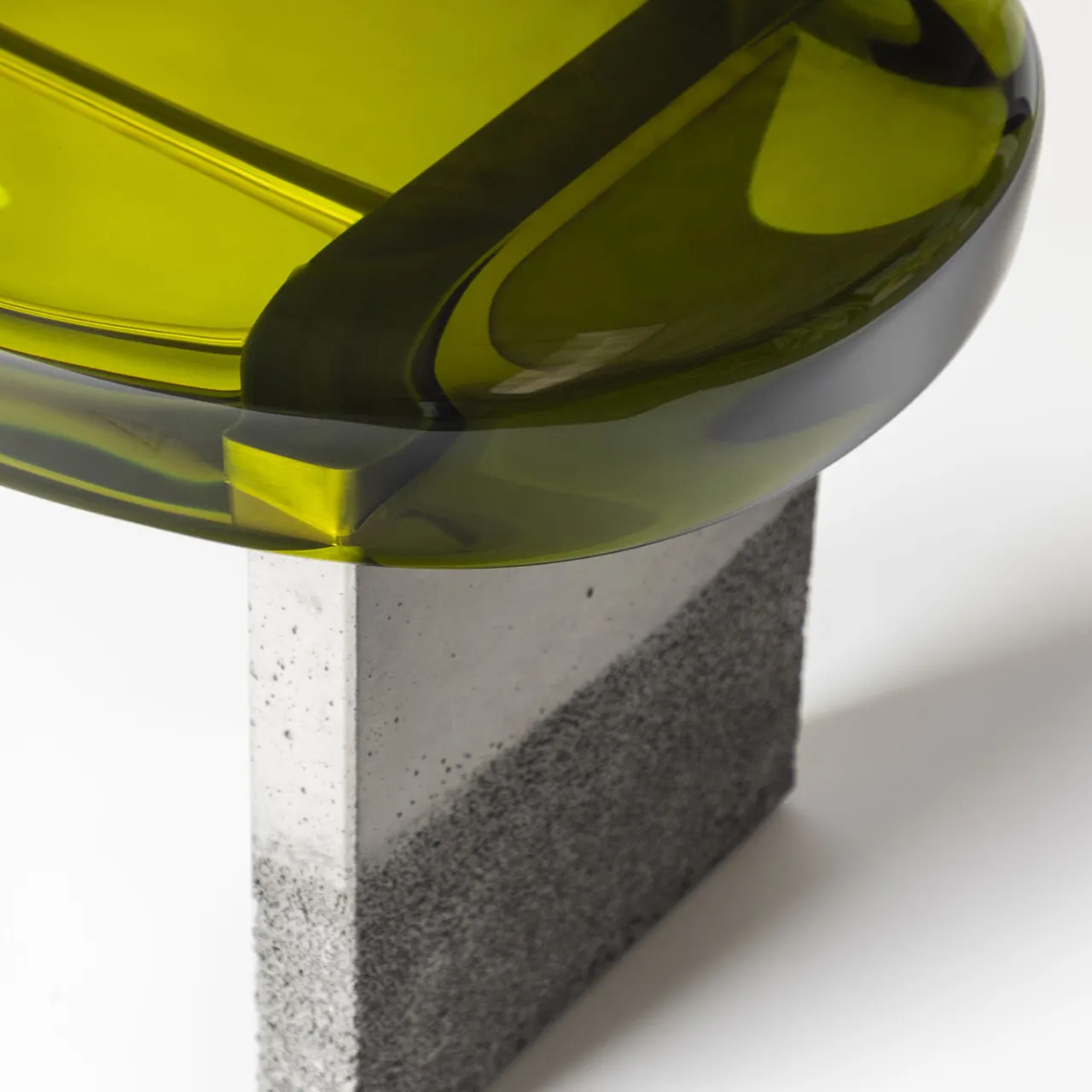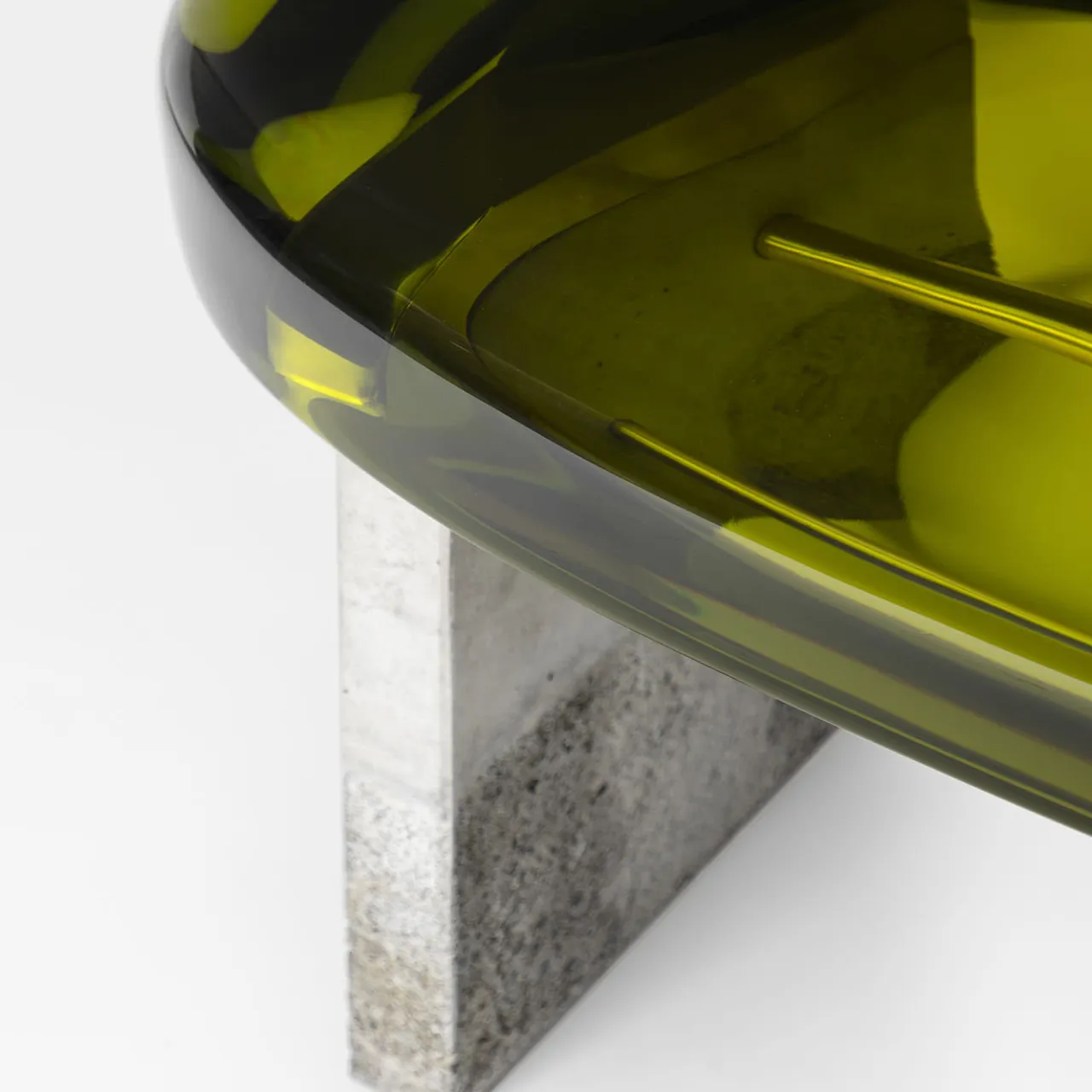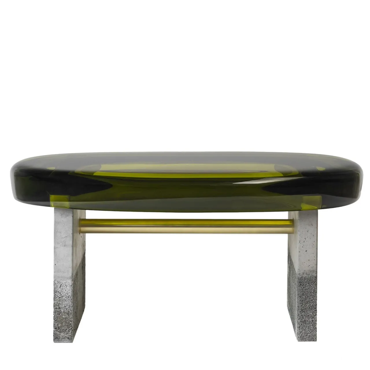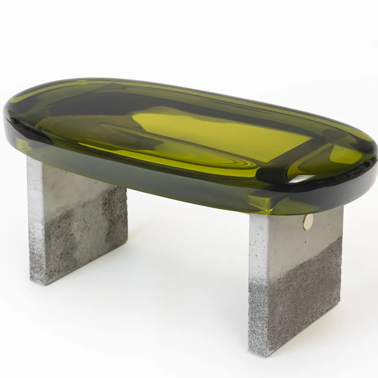 Con una composizione formale stilizzata, la panca Golia presenta una spessa seduta ovale in resina epossidica sostenuta da due gambe squadrate in cemento, tenute insieme da una barra di ottone. La resina trasparente rivela le maglie metalliche lucide sottostanti, creando una visione a più livelli che alleggerisce la solidità della base. Disponibile in diversi colori.
