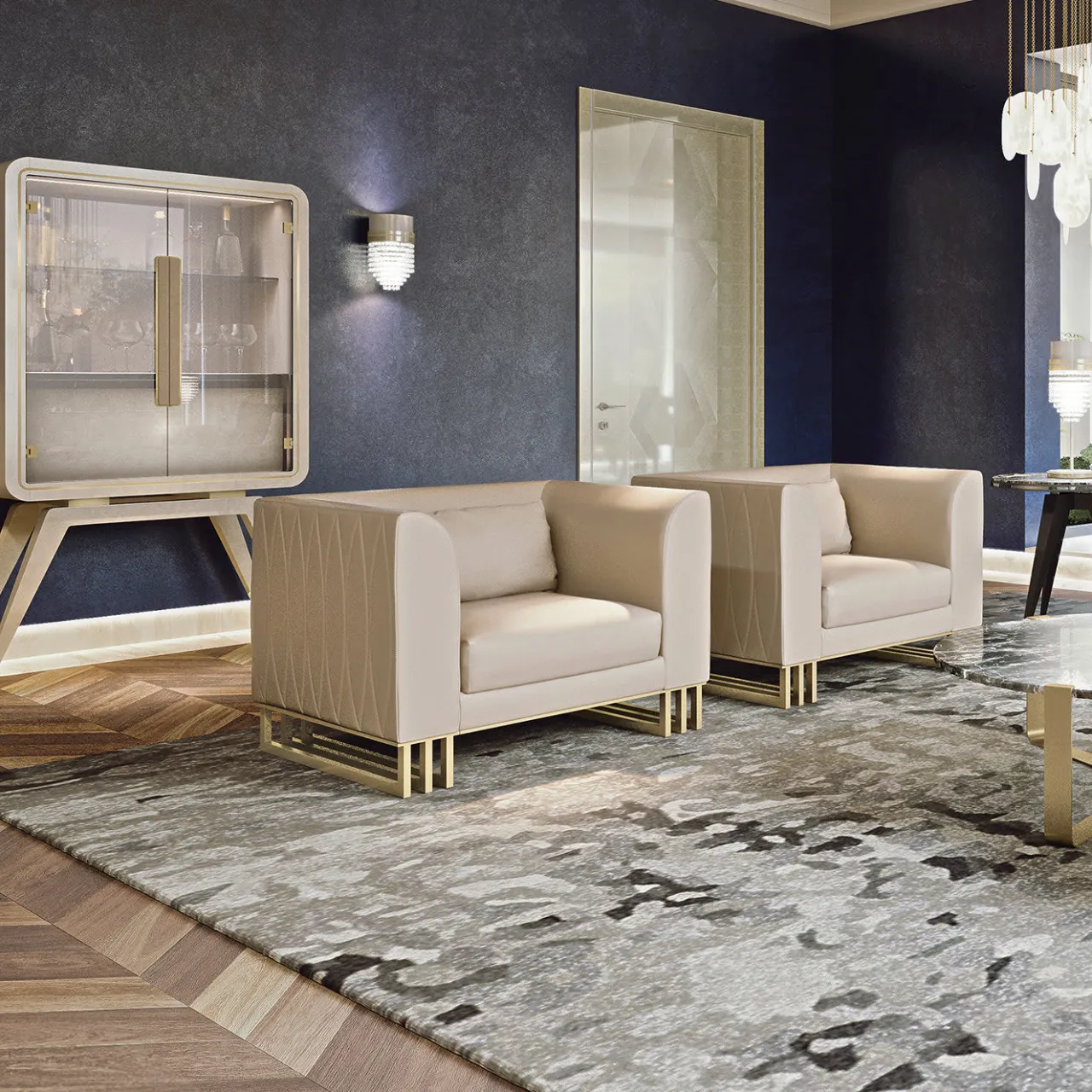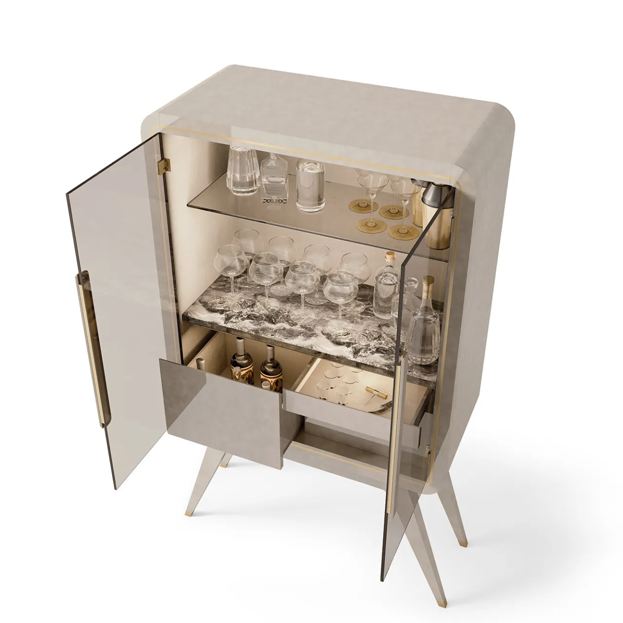 Sfoggia la tua collezione di bicchieri in uno stile contemporaneo e fresco con l’unità bar Hanami Natural Mood. Su solide gambe in legno, l’unità bar può essere personalizzata con una varietà di vernici, mostrata qui in alto lucido Pearl Champagne. Con due porte in vetro, il mobile ha tre cassetti interni con chiusura morbida e uno scaffale in marmo grigio Orobico. È inclusa una striscia LED con sensore.