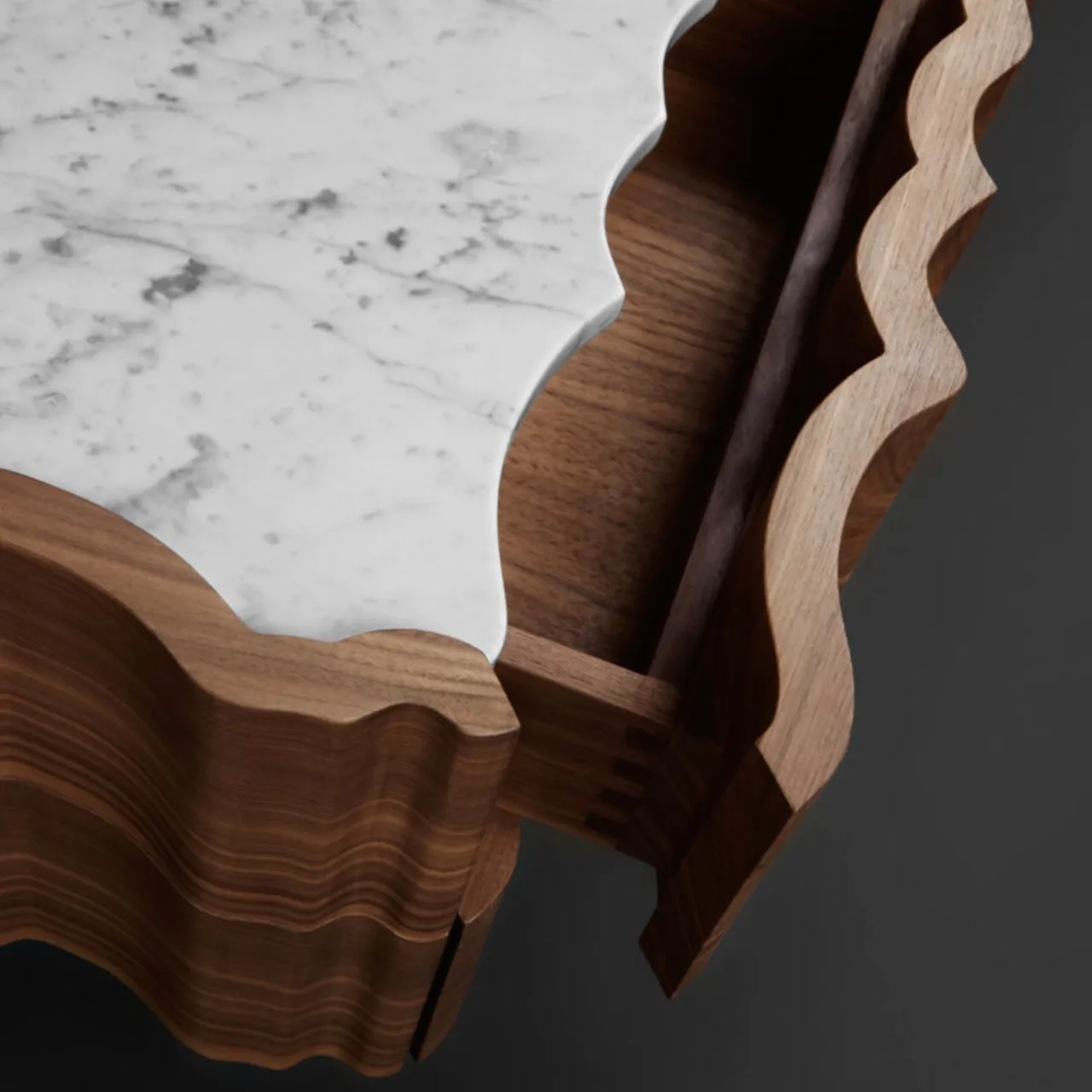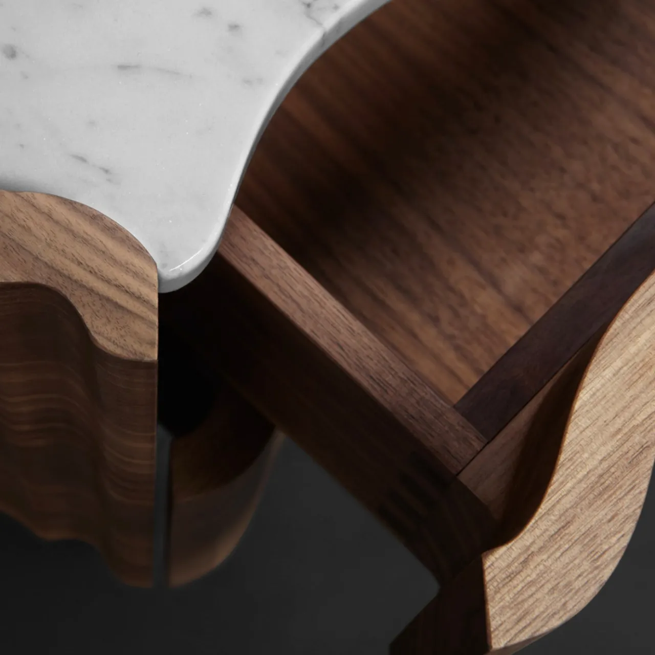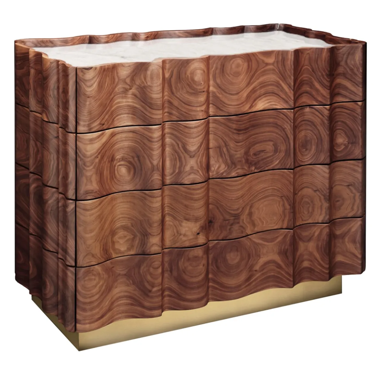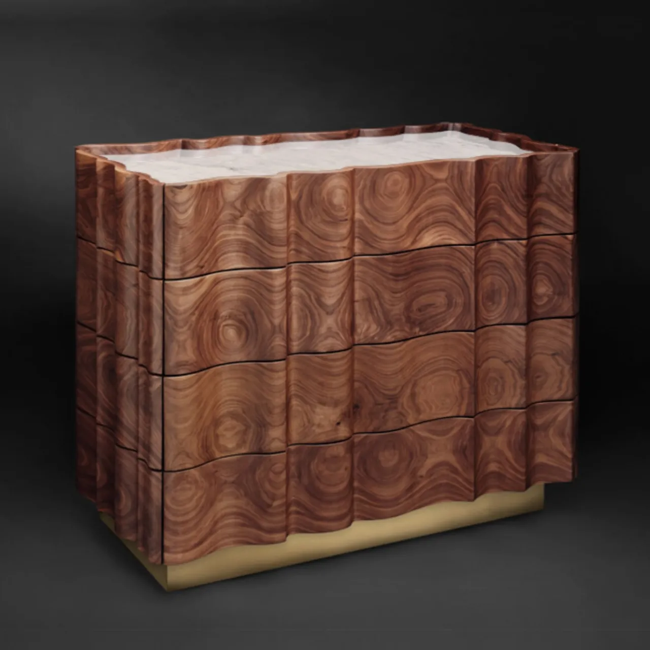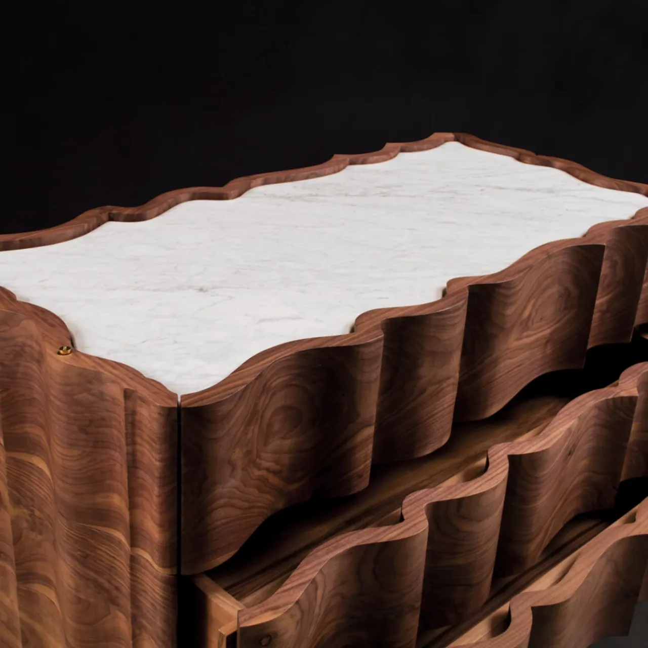 Il Pezzo 2 Cassettiera ha una forma classica e sinuosa. Il piano è una bella lastra di marmo bianco di Carrara, la base è in ottone, mentre il noce, ricavato da un unico pezzo, mostra le sue magnifiche venature. In ogni pezzo un piccolo cilindro di ottone con un numero personalizzato ne attesta l’unicità e l’autenticità. Questo pezzo può essere realizzato su misura nelle dimensioni e nelle finiture desiderate.