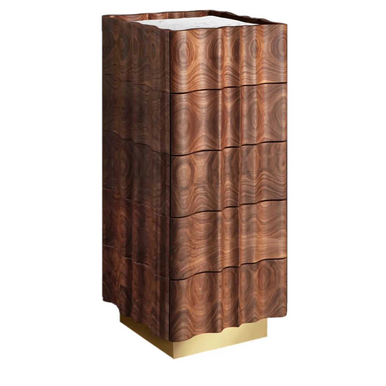 Il Pezzo 2 Settimino ha una forma classica e sinuosa. Il piano è una bella lastra di marmo bianco di Carrara, la base è in ottone, mentre il noce, ricavato da un unico pezzo, mostra le sue magnifiche venature.In ogni pezzo un piccolo cilindro di ottone con un numero personalizzato ne attesta l’unicità e l’autenticità.Questo pezzo può essere realizzato su misura nelle dimensioni e nelle finiture desiderate.