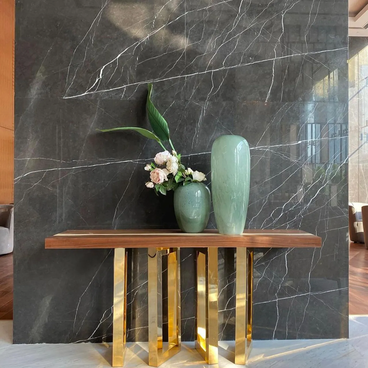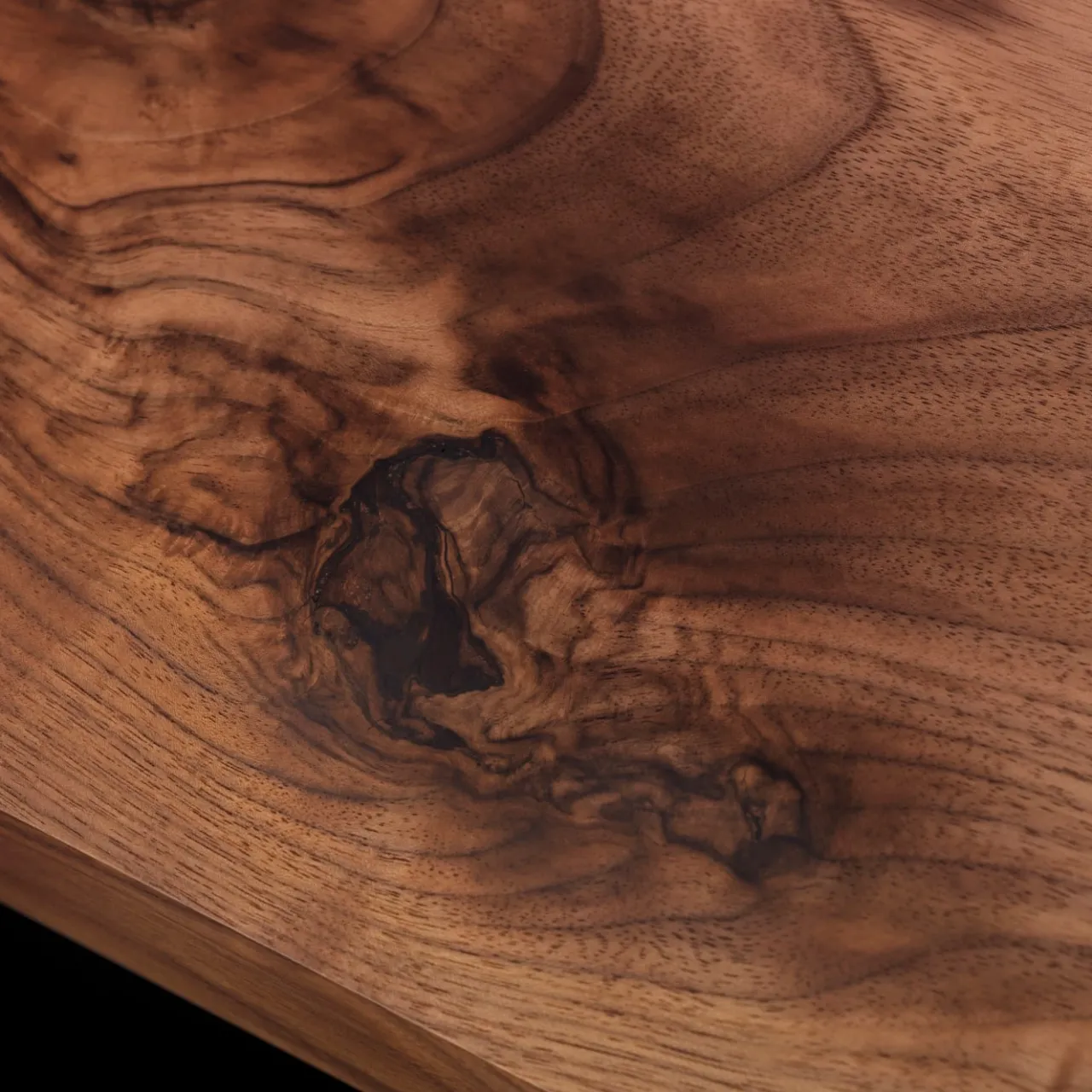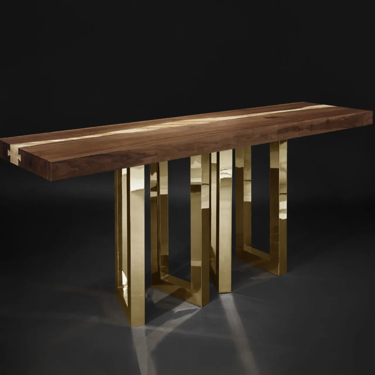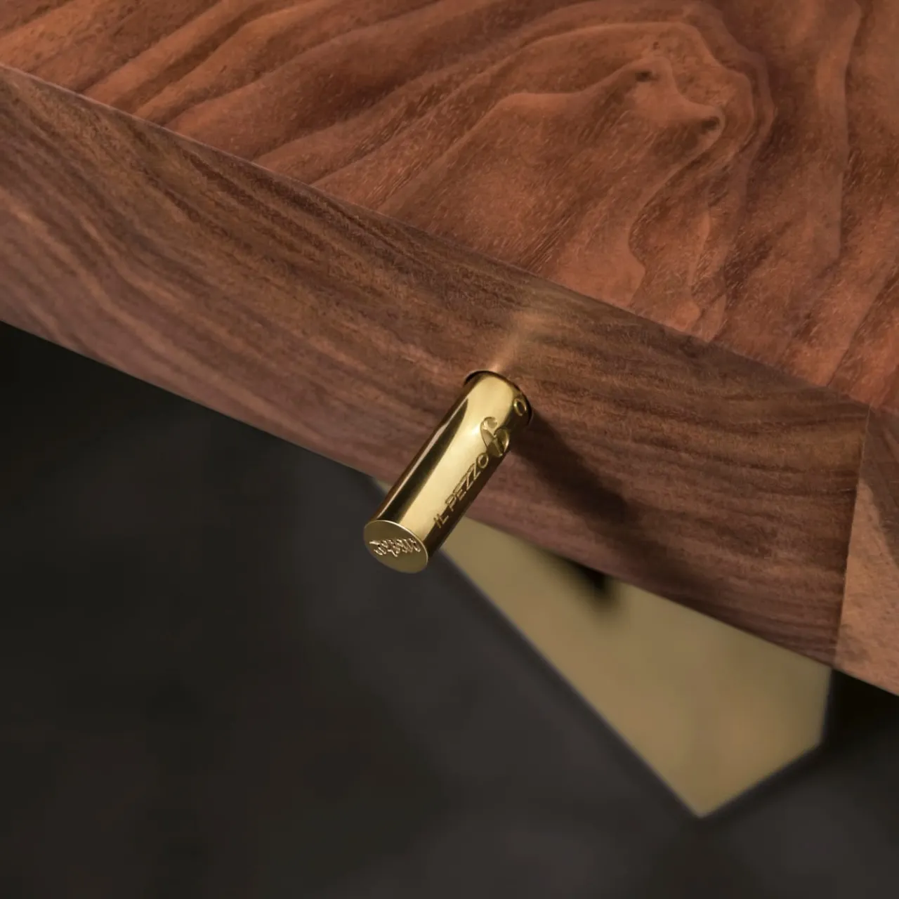 Il Pezzo 6 Consolle è un solido blocco di noce sostenuto da gambe in ottone lavorate a mano. Una vena di legno a contrasto, che ricorda lo scorrere di un fiume, attraversa il piano in noce spesso 7 cm. Il legno è trattato con olio naturale per proteggerlo e preservarne la bellezza tattile, ed è resistente all’acqua. In ogni pezzo, un piccolo cilindro di ottone con un numero personalizzato ne attesta l’unicità e l’autenticità. Può essere realizzato su misura in base alle dimensioni e alle finiture desiderate.
