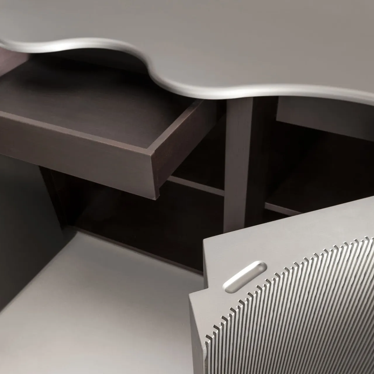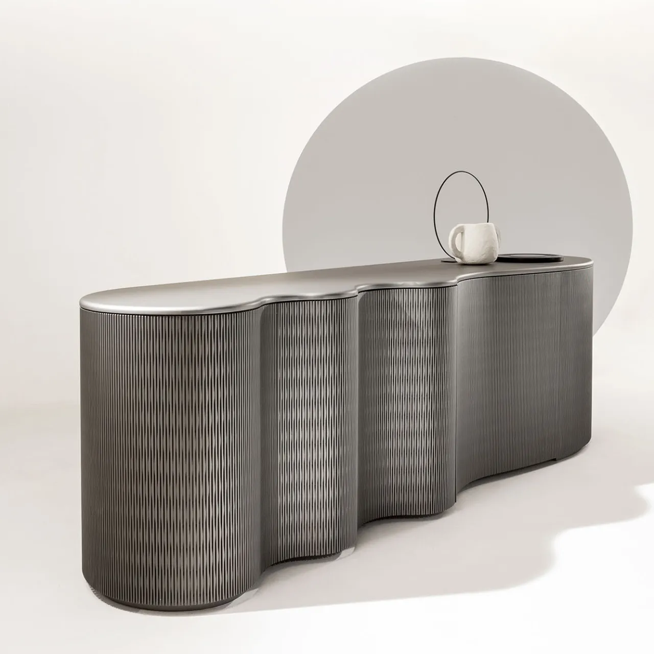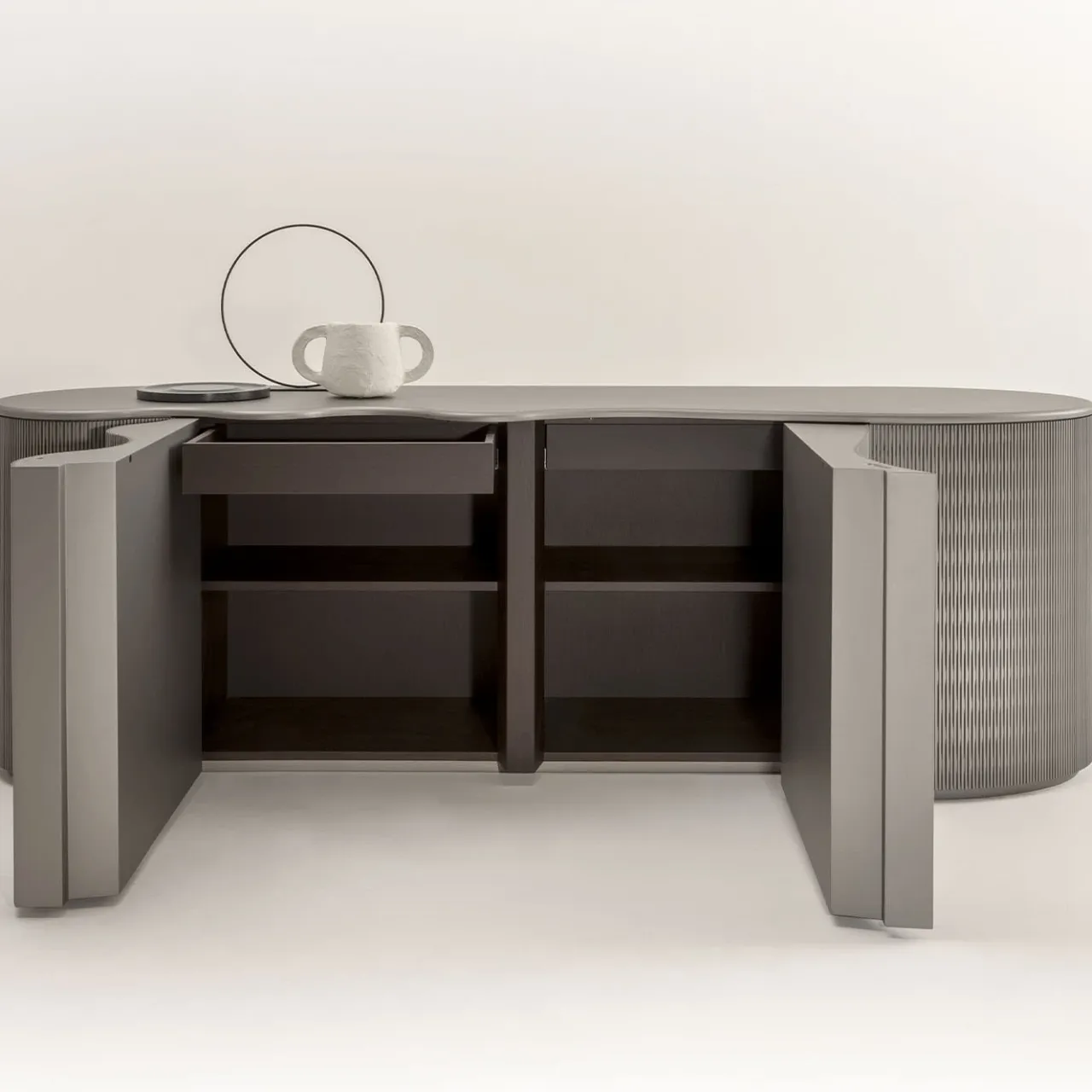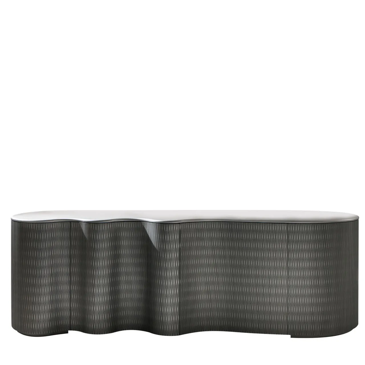 Una silhouette ondulata che richiama la superficie increspata dell’oceano dichiara immediatamente il fascino scultoreo di questa credenza in legno laccato Lacca 61 stagno. Dotata internamente di due ripiani e cassetti, presenta due ante a battente texturizzate con un meccanismo push-pull che non interrompe la sua estetica fluida. Sigillato da un piano liscio, il pezzo può essere personalizzato in una varietà di colori di laccatura e opzioni di finitura su richiesta al Concierge.