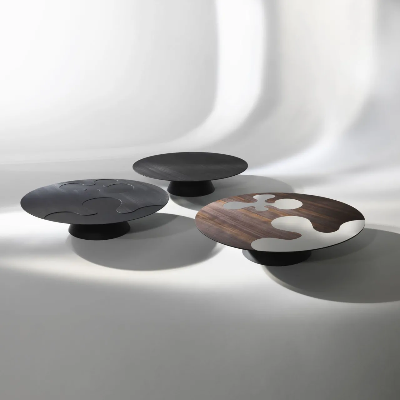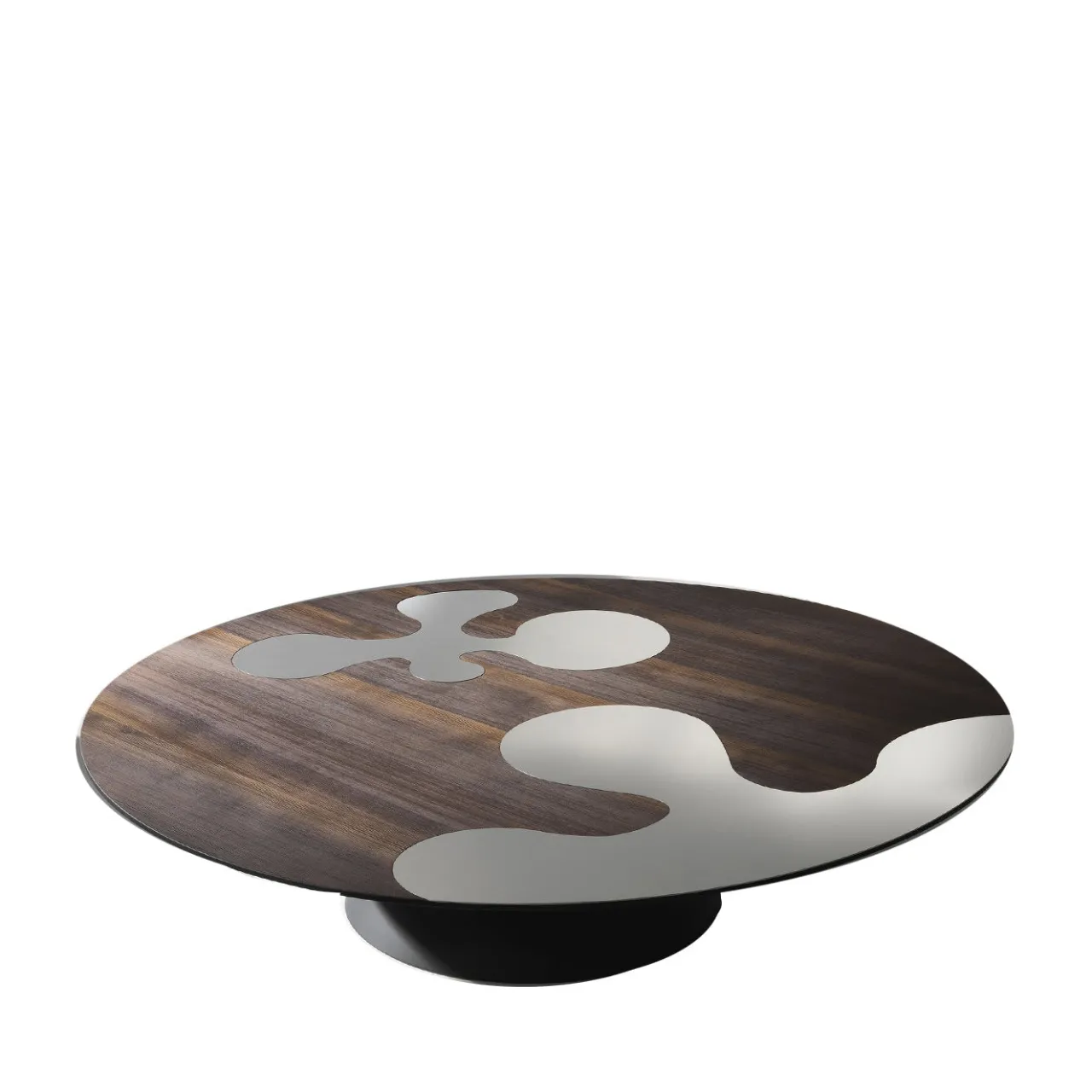 Questo tavolino basso attira gli sguardi indipendentemente dalla sua collocazione. Il piano rotondo in legno di larice impiallacciato e termotrattato presenta una decorazione di grande effetto, ottenuta grazie all’uso di inserti in acciaio inox dalla forma organica. Il contrasto tra il legno naturale e l’acciaio lucido è davvero meraviglioso da vedere. Si crea un equilibrio tra i due materiali che si traduce in un potente effetto visivo. Il piano poggia su una base rotonda e corta che permette di vedere facilmente il piano dall’alto.