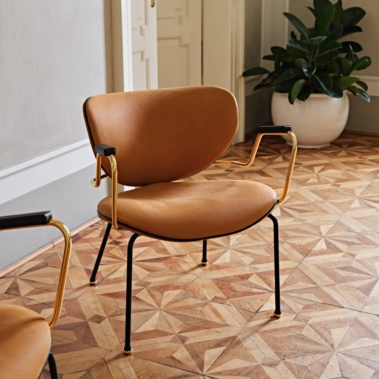 Ideale per completare con la stessa facilità l’elegante contract degli ambienti domestici, questa poltrona è stata progettata all’insegna della semplicità e del lusso. L’elegante struttura in tubolare metallico verniciato nero – che ricalca anche i braccioli opzionali – ha i piedi arricchiti da accenti dorati e lucidi, mentre lo schienale e la seduta in faggio curvato condividono la stessa imbottitura in poliuretano espanso ad alta resilienza, sigillata da un pregiato rivestimento in pelle marrone.