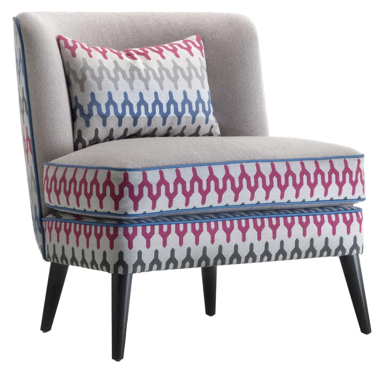 Ipnotizzante nei motivi quanto vivace nella combinazione di colori, questa poltrona lounge è una vetrina di competenza sartoriale. I piedi affusolati in laccato nero sostengono la scocca e il cuscino della seduta riccamente imbottiti, rivestiti in una combinazione di tessuto policromo di ispirazione geometrica anni ’60 e tessuto solido bianco sporco, per un gioco di contrasti di indubbio fascino glamour.