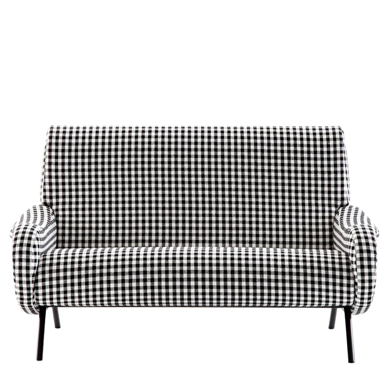 Lady – Divano a 2 posti con base in acciaio – edizione iconica – Rivestimento a quadri bianchi e neri, base color basalto. Icona del design italiano degli anni Cinquanta, la poltrona-divano Lady si distingue per la sua costruzione straordinariamente contemporanea, simbolo di innovazione suprema, in termini di stile, materiali e tecnologia. Oltre a essere la prima poltrona a incorporare poliuretano espanso e gommapiuma, la seduta della poltrona presenta un nuovo sistema di molleggio, che utilizza cinghie elastiche rinforzate per garantire il massimo comfort; mentre le gambe in metallo, sottili e slanciate, evidenziano la leggerezza del design. La struttura è contenuta nella seduta, nello schienale e nei braccioli e il risultato è un vero e proprio capolavoro di eccellenza del design italiano, tanto che Lady fu premiata con la Medaglia d’Oro alla IX Triennale di Milano, nel 1951. La nuova riedizione di Cassina si concentra sull’aspetto della sedia Lady, aggiungendo una deliziosa gamma di nuove opzioni di tessuto, tra cui un numero del designer belga Raf Simons.