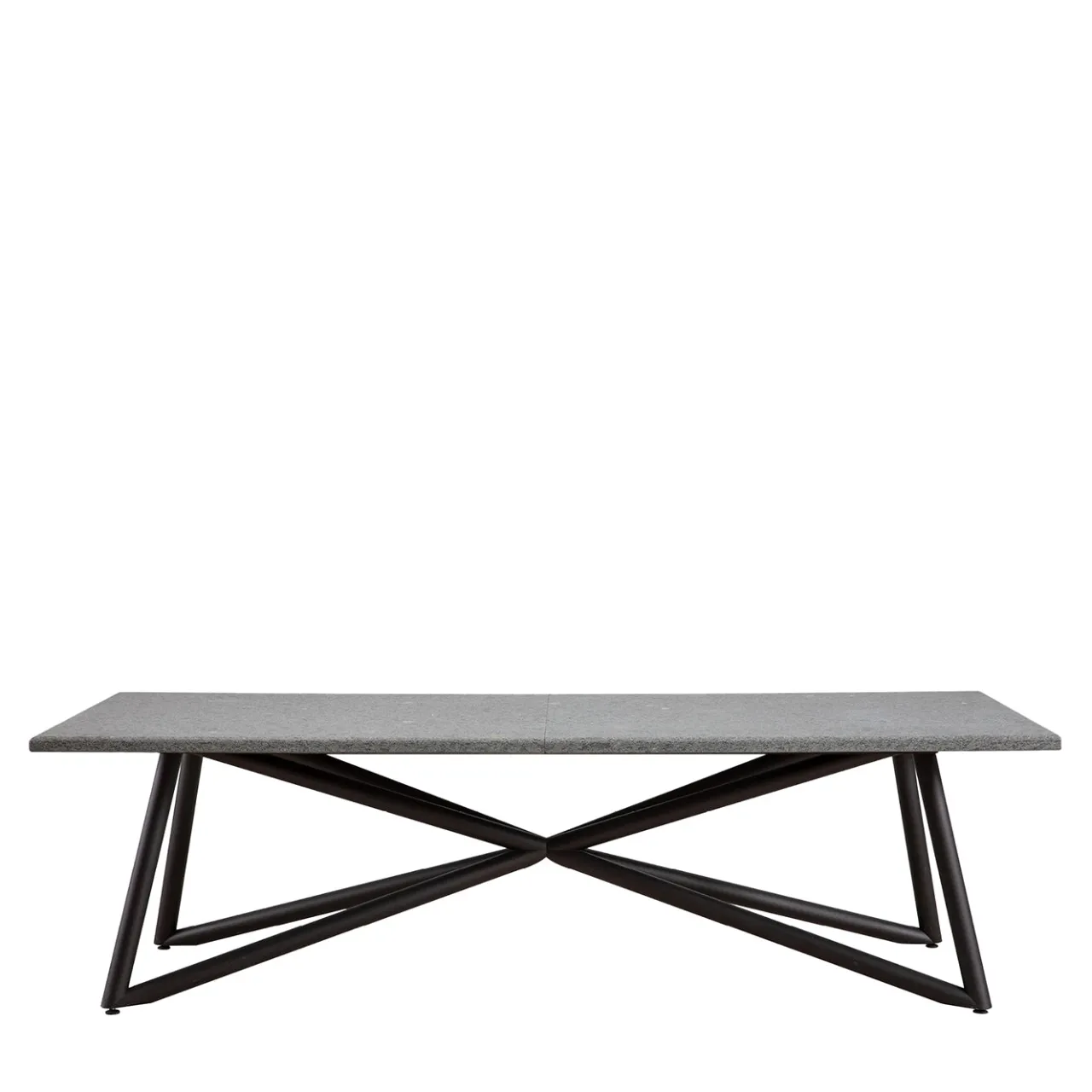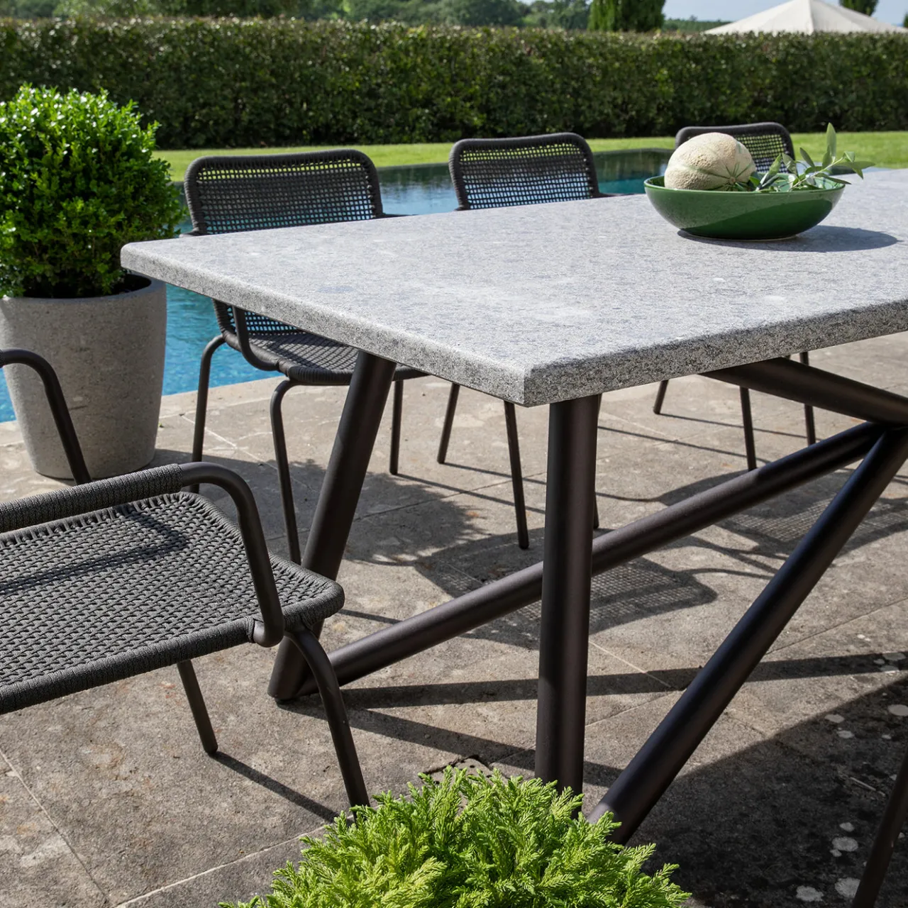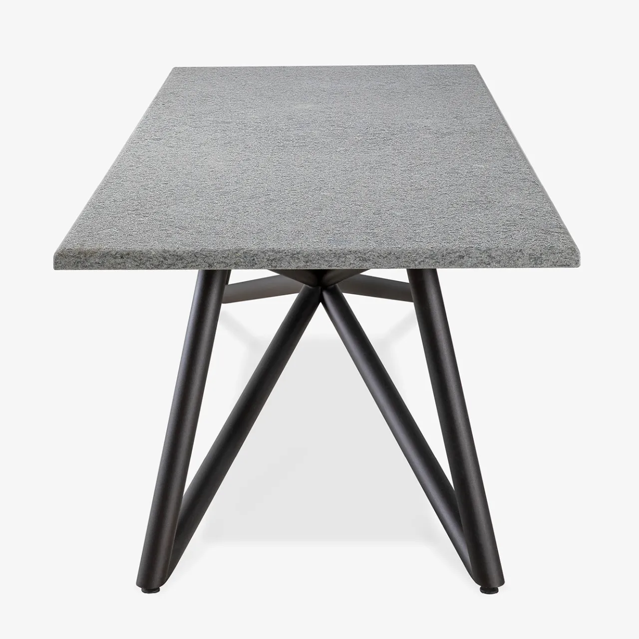 Il tavolo Larte in pietra peperino presenta un piano rettangolare composto da due elementi in pietra levigata, trattati per resistere a macchie e agenti atmosferici. La base scultorea, realizzata con tubi in acciaio zincato intrecciati, è rifinita in marrone scuro con polveri termoindurenti, garantendo resistenza e durata all’esterno. I bordi arrotondati e la lavorazione di precisione, ottenuta tramite avanzate tecnologie di taglio e saldatura CNC, esaltano il carattere raffinato e l’eleganza contemporanea del tavolo.