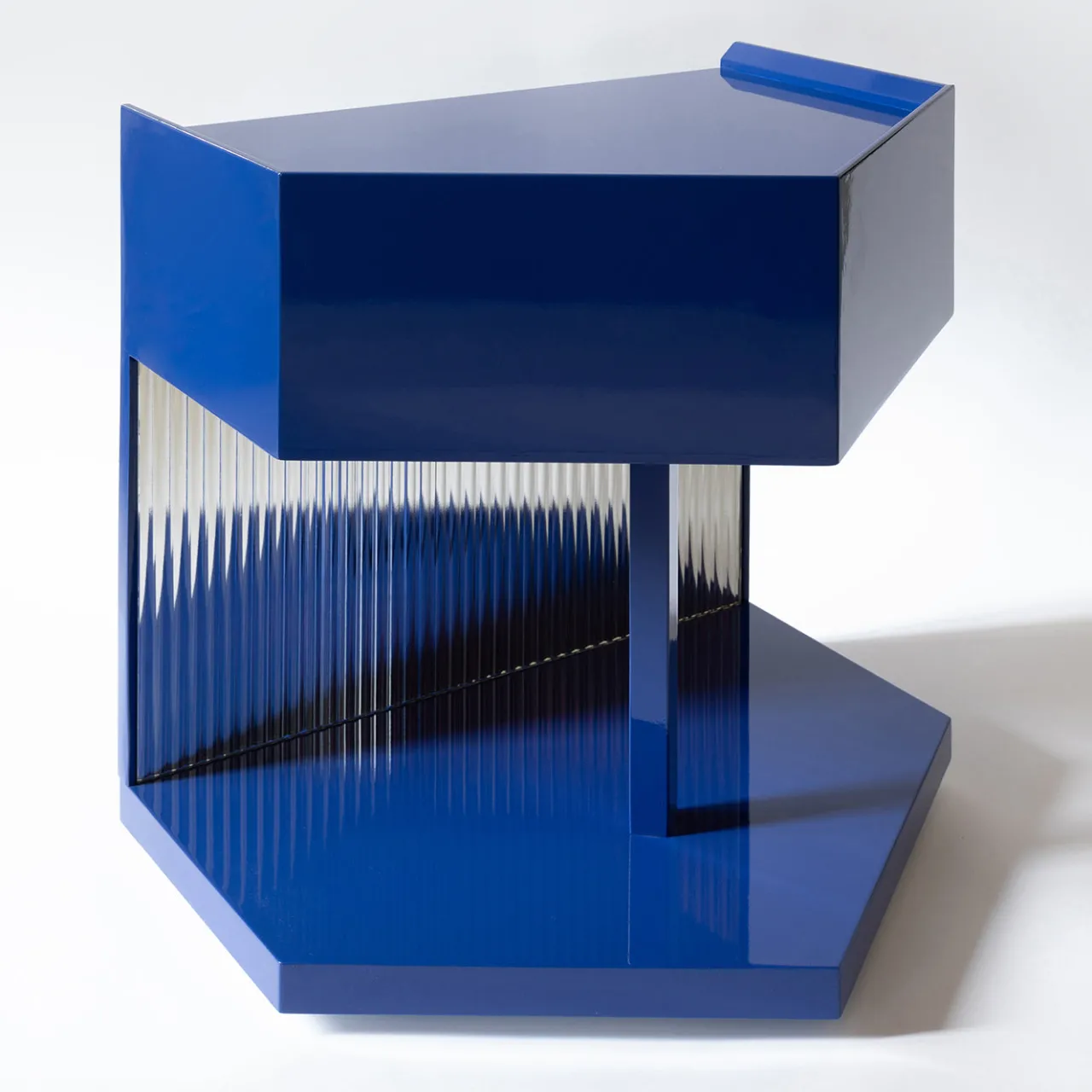 Last Call è un comodino versatile e raffinato della collezione Motel, caratterizzato da una forma esagonale unica con una finitura in lacca blu ad alto gloss. Il suo design include un cassetto nascosto e un distintivo dettaglio a specchio a flauto tra la base e il piano. Adatto sia per progetti residenziali che commerciali, questo pezzo combina uno stoccaggio funzionale con una moderna eleganza geometrica.