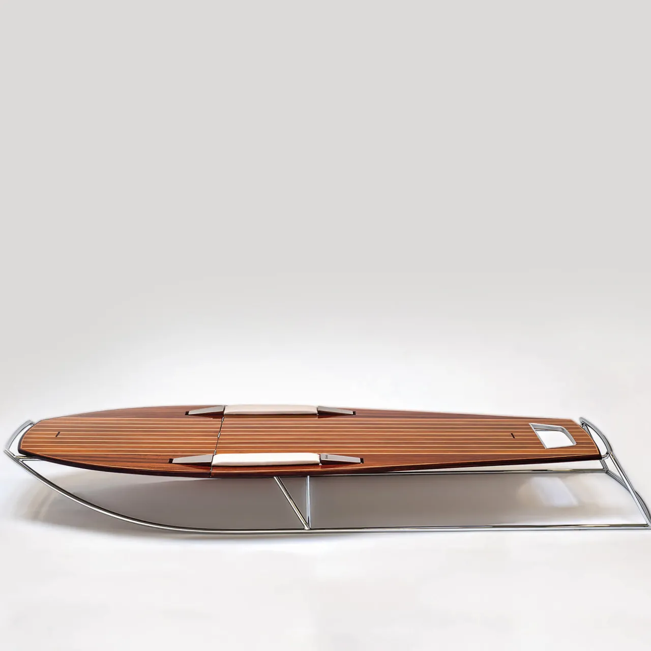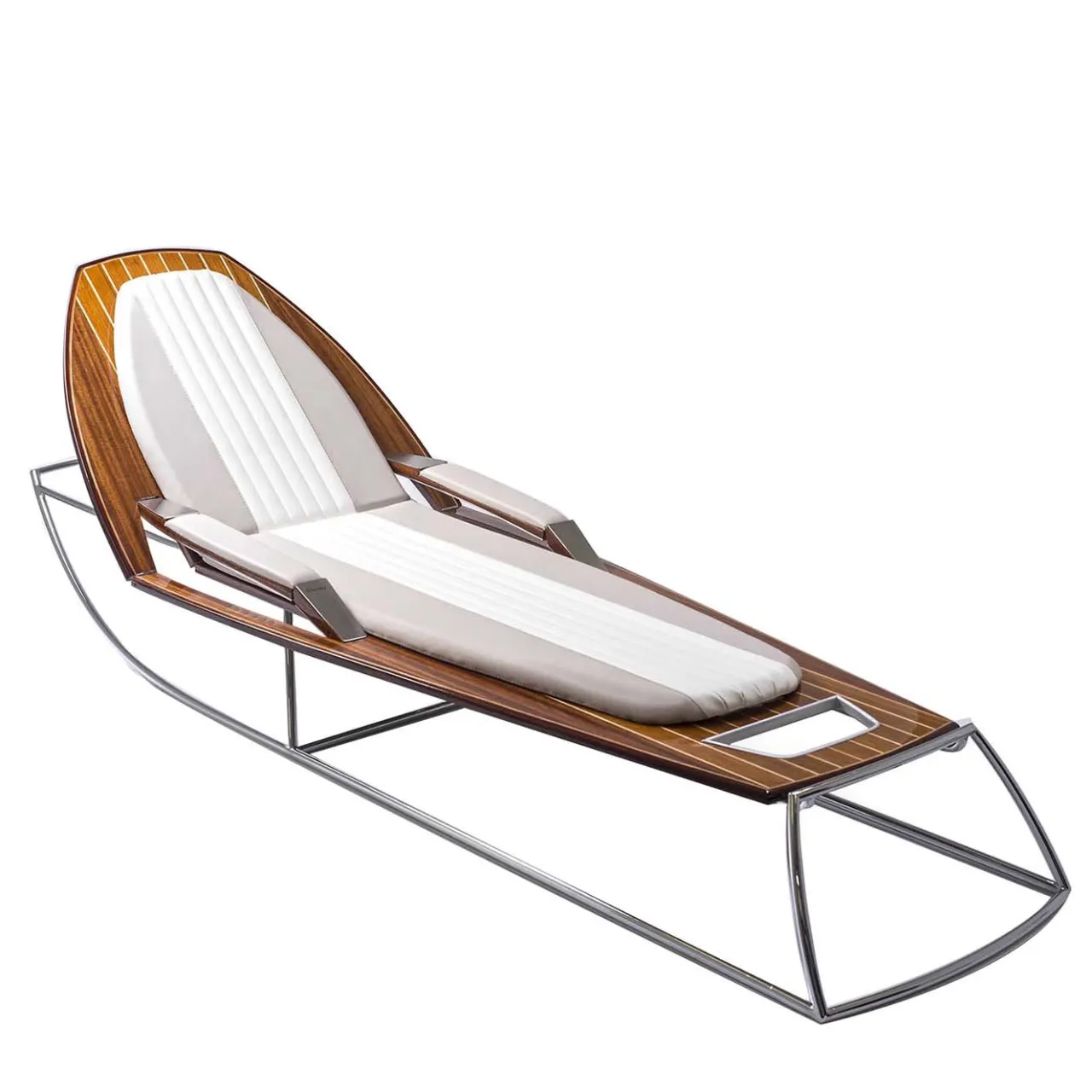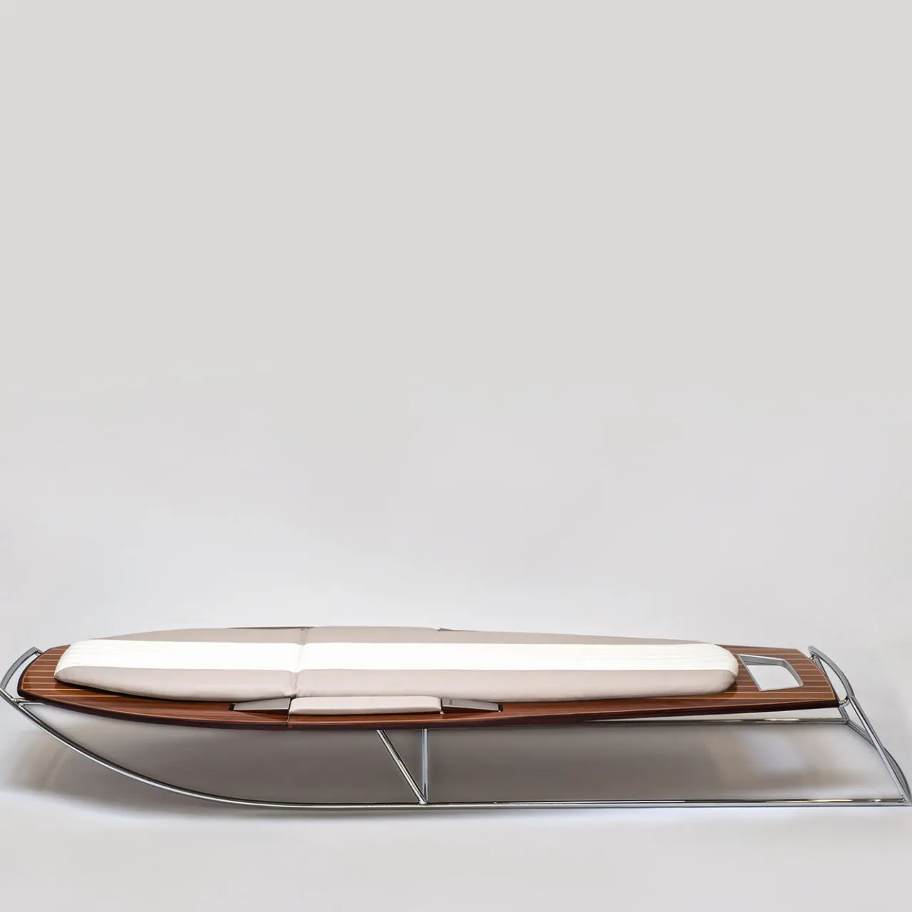 Il fascino senza tempo delle iconiche imbarcazioni Riva degli anni ’60 è celebrato in questo straordinario lettino, sostenuto da una struttura tubolare in acciaio inox (spessore 1,8 cm) con finitura lucida. Il piano di appoggio in compensato è impiallacciato in pregiato teak per la fascia centrale e in mogano per le fasce laterali, il tutto rifinito con una vernice nautica lucida. I braccioli sono realizzati in mogano massiccio e presentano dettagli in acciaio inox satinato che racchiudono le superfici di appoggio. Il lettino è imbottito e rivestito in PVC, lo stesso materiale utilizzato per il comodo materassino bicolore con profili verticali.
