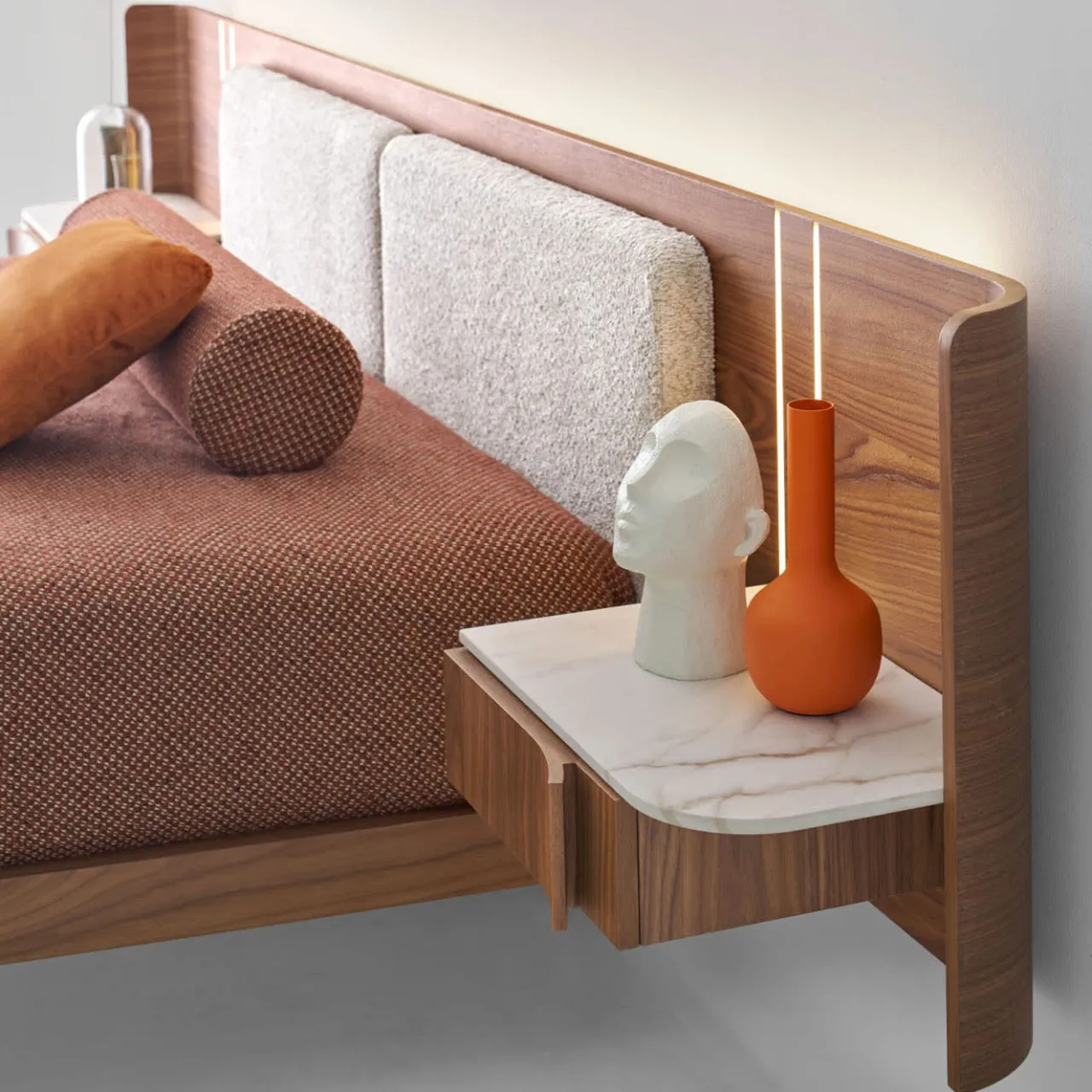 Il letto Book (American king size) con testiera moderna sagomata sui lati è realizzato in legno di noce canaletto, ha una testata con 2 cuscini sfoderabili in tessuto Boucle’ colore Oyster, e comprende 2 comodini con top in ceramica e luci LED integrate. Il letto è verniciato in colore Havana e poggia su un piede in vetro trasparente che, a scelta, può essere illuminato da una luce LED. La testata deve essere fissata alla parete con uno speciale sistema di fissaggio. Solo la struttura del letto è inclusa nel prezzo.