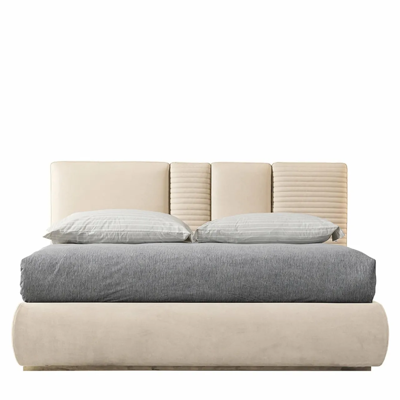 Letto Rainbow in formato Us King (193×203 cm). Con testata imbottita con 2 cuscini con cucitura a barrè e giroletto imbottito. Finitura base: Canaletto Avana. Rivestimento: Ecopelle Cappuccino. Esclusi rete e materasso. Sono disponibili anche altre misure