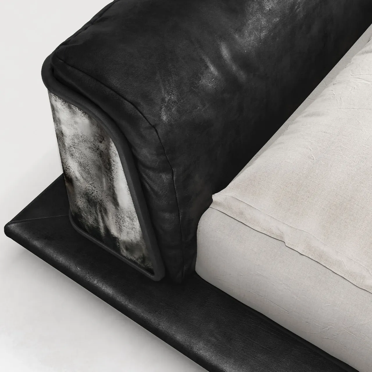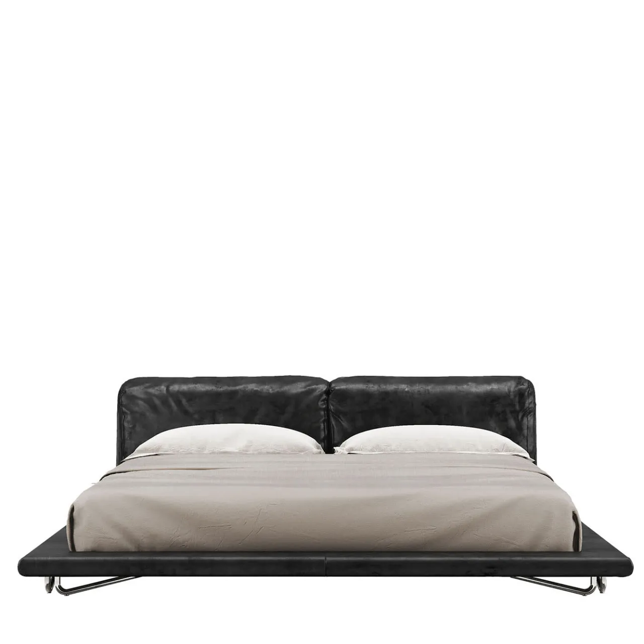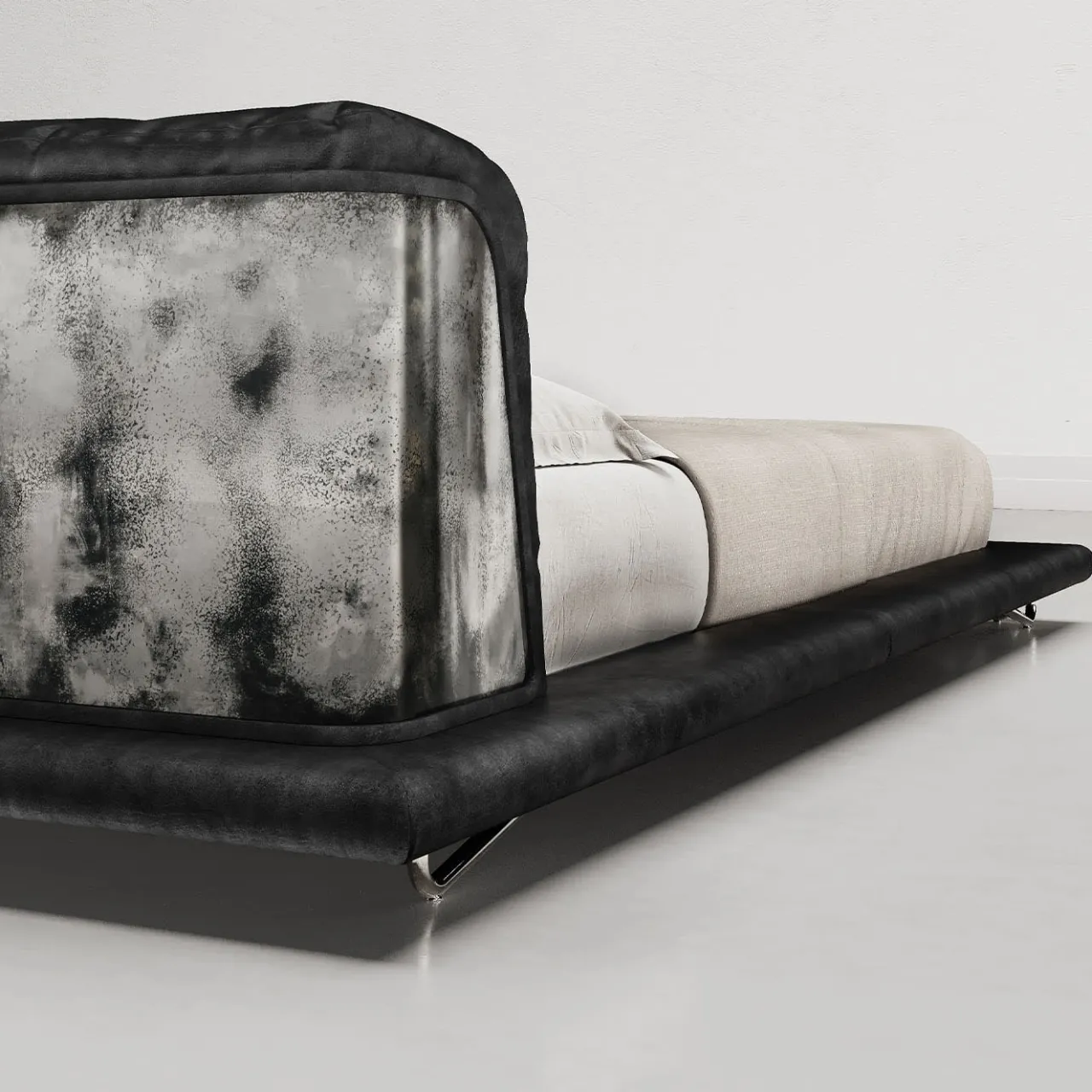 Il letto Saint Germain è rivestito in pelle nera e presenta una struttura in legno con giroletto imbottito a sbalzo sostenuto da piedi in tubolare d’acciaio. La testata comprende cuscini in poliuretano espanso e misto piuma d’oca, racchiusi in un guscio di legno rivestito in acciaio. Il letto è dotato di una rete a doghe in legno. Le finiture in ottone spazzolato nero e argento grezzo aggiungono raffinatezza, con dimensioni e finiture personalizzate disponibili su richiesta. I cuscini non sono inclusi.