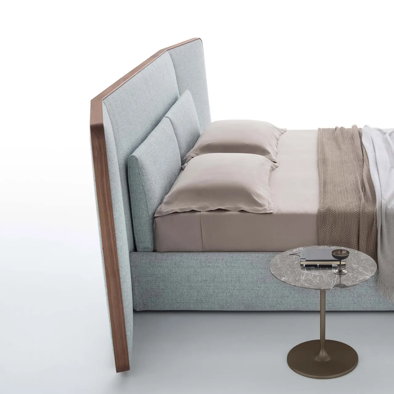 Accattivante nella sua elegante semplicità, questo letto disegnato da Giuseppe Bavuso incarna una moderna raffinatezza. La struttura della testata è imbottita in poliuretano espanso e rivestita in tessuto grigio. La cornice della testata e’ in noce canaletto. Il giroletto è realizzato in legno di abete e rivestito in poliuretano espanso. La rete è in multistrato di betulla con doghe curve e regolatori di rigidità nella zona lombare. Materasso, cuscini e biancheria non sono inclusi nel prezzo.