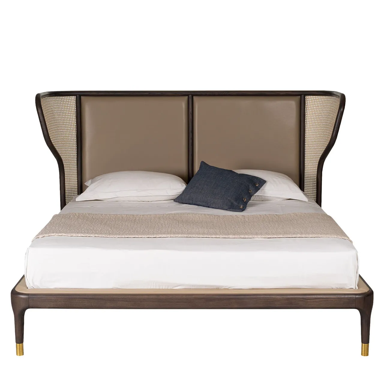 Questo letto, che vanta le linee pulite e slanciate del designer contemporaneo Libero Rutilo, è un accento audace ed elegante per l’arredamento di una camera da letto moderna. La struttura è in legno di frassino e poggia su piedi in ottone, arricchita da un poggiatesta sagomato e maestoso con fianchi in paglia di Vienna e da un rivestimento in pelle o tessuto a scelta. Il letto è morbidamente imbottito e rivestito in tessuto o pelle. Il materasso non è incluso, si prega di consultare il Concierge per ulteriori dettagli.