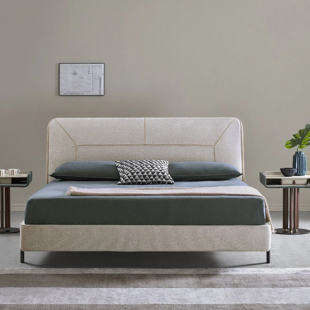 Questo letto king-size presenta una testiera imbottita, arricchita da cuciture decorative in gros grain. La sua struttura combina legno con imbottitura in poliuretano e presenta una rete in metallo con doghe di faggio, dotata di molle integrate per un maggiore comfort. Il letto poggia su piedini in metallo a sezione ovale con finitura bronzo, ciascuno completato da un inserto in faggio tinto wengé. Rivestito in tessuto Bonsai Col. 074 con piping simil Alcantara. Il rivestimento è fisso e non rimovibile. Contenitore non disponibile. Per opzioni di dimensioni e rivestimenti alternativi, si prega di contattare il Concierge. Materasso e cuscini decorativi non inclusi.