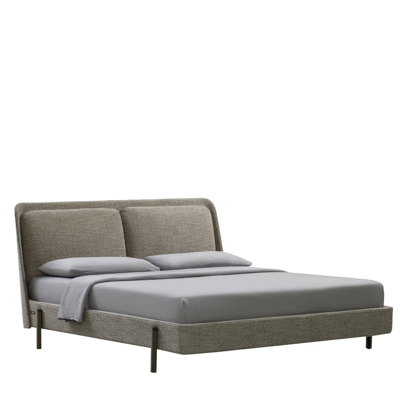 Letto con struttura in legno imbottita in schiuma di poliuretano, completata da una base a doghe in metallo con inserti in faggio. La struttura è fissa, priva di contenitore, e poggia su piedini in metallo con finitura bronzo. La testiera è arricchita da due cuscini removibili, fissati tramite Velcro. L’intero letto è rivestito in tessuto San Diego col. 96. Materasso escluso. Rivestimento non sfoderabile.Per dimensioni e opzioni di rivestimento alternative si prega di contattare il Concierge