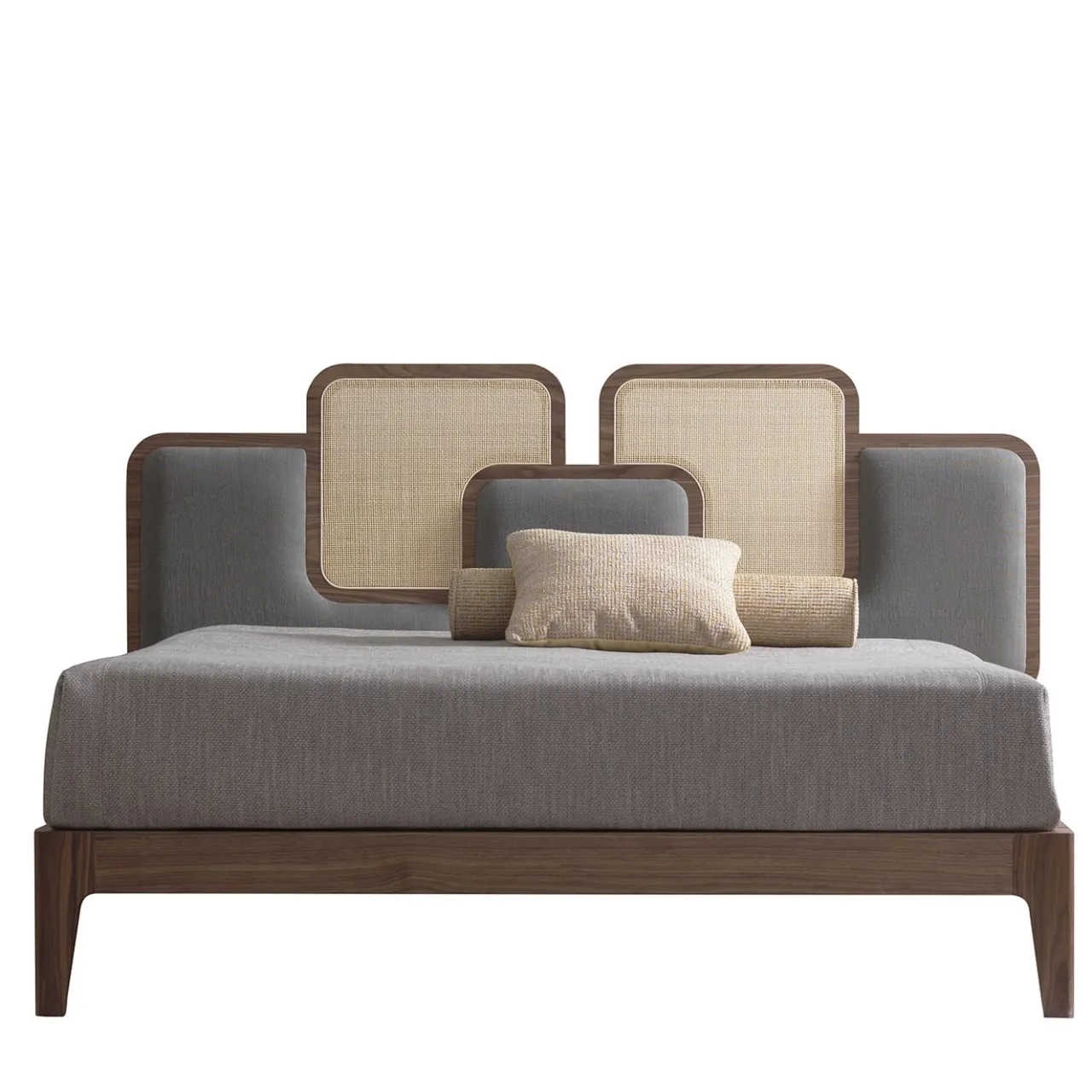 Realizzato in lussuoso noce canaletto, il letto Nuvola presenta un’originale testata con tre cuscini imbottiti e due cuscini in rattan naturale che creano un perfetto equilibrio di texture. Progettato per un materasso king size (195×205 cm), il letto è dotato di una rete a doghe per il sostegno. Un raffinato mix di materiali naturali e design contemporaneo, che aggiunge sobria eleganza a qualsiasi spazio. Il materasso non è incluso, si prega di contattare il Concierge per maggiori dettagli.