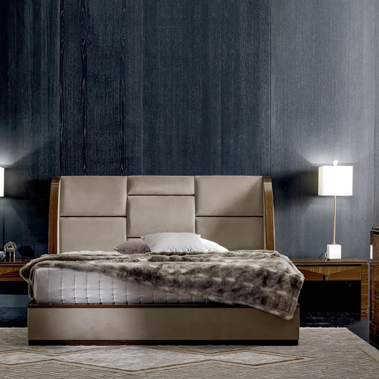 Questo letto matrimoniale unisce l’eleganza disinvolta di profili moderni e puliti al fascino lussuoso di preziosi dettagli sartoriali. La sua imponente struttura è rivestita in tessuto Nubuck finto beige, mentre la base e i profili sono arricchiti da inserti in noce canaletto opaco. I profili curvi segnano il letto e un imponente poggiatesta coordinato completa il pezzo. La struttura del letto (180×200 cm) è inclusa nell’acquisto.