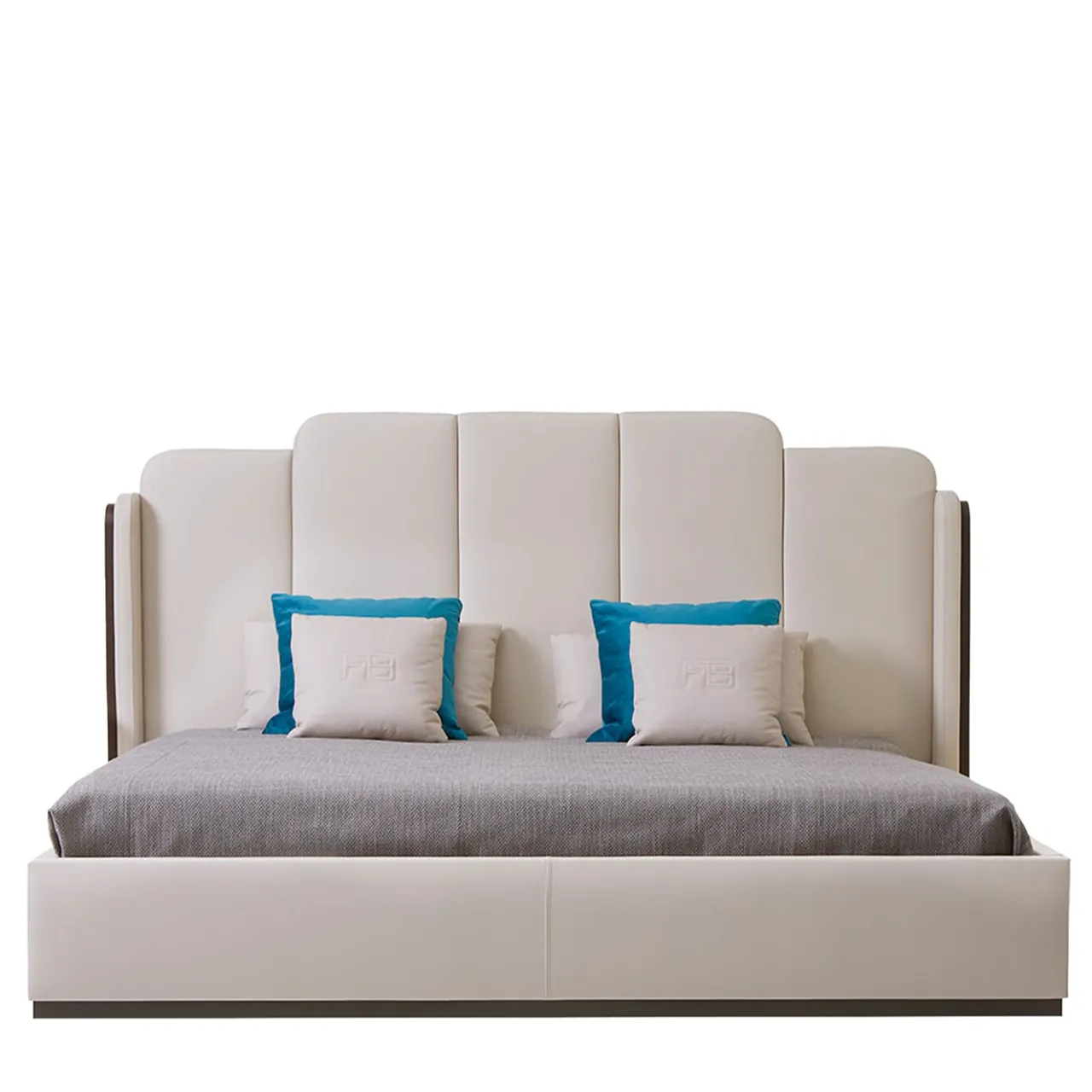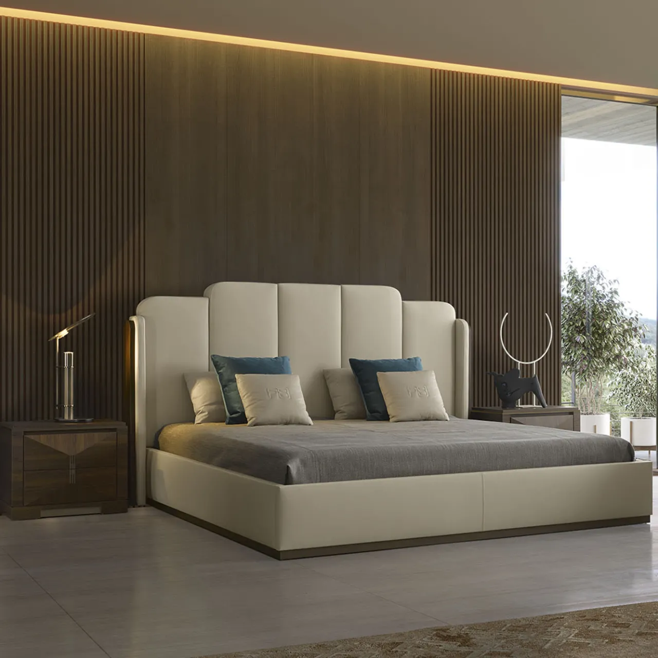 Questo letto, in uno straordinario equilibrio tra eleganza e modernità, è completamente rivestito in lussuosa ecopelle “Cappuccino”. L’alta testata segmentata attira l’attenzione con le sue curve morbide e i pannelli verticali, creando un senso di sobria raffinatezza. La testiera è affiancata da eleganti pannelli laterali in legno di noce canaletto, mentre la base è impreziosita da uno zoccolo in metallo dorato, che aggiunge un sottile tocco di glamour. Progettato per una struttura di 195×205 cm, l’acquisto non include doghe, materasso o cuscini.